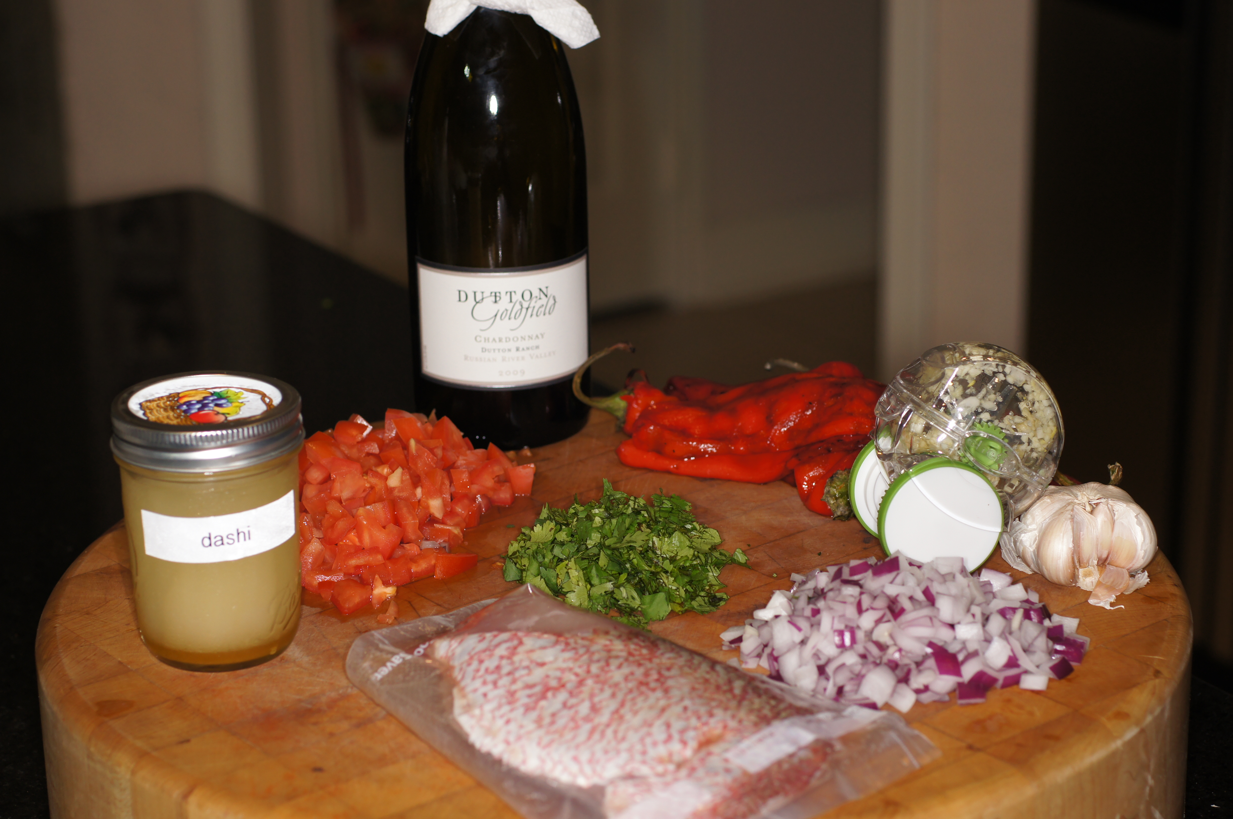 The net result was a delicious and beautiful Roasted Red Pepper Stuffed with Red Snapper, Tomato, Onion & Cilantro with a Dashi, White Wine, Cilantro Cream Sauce.