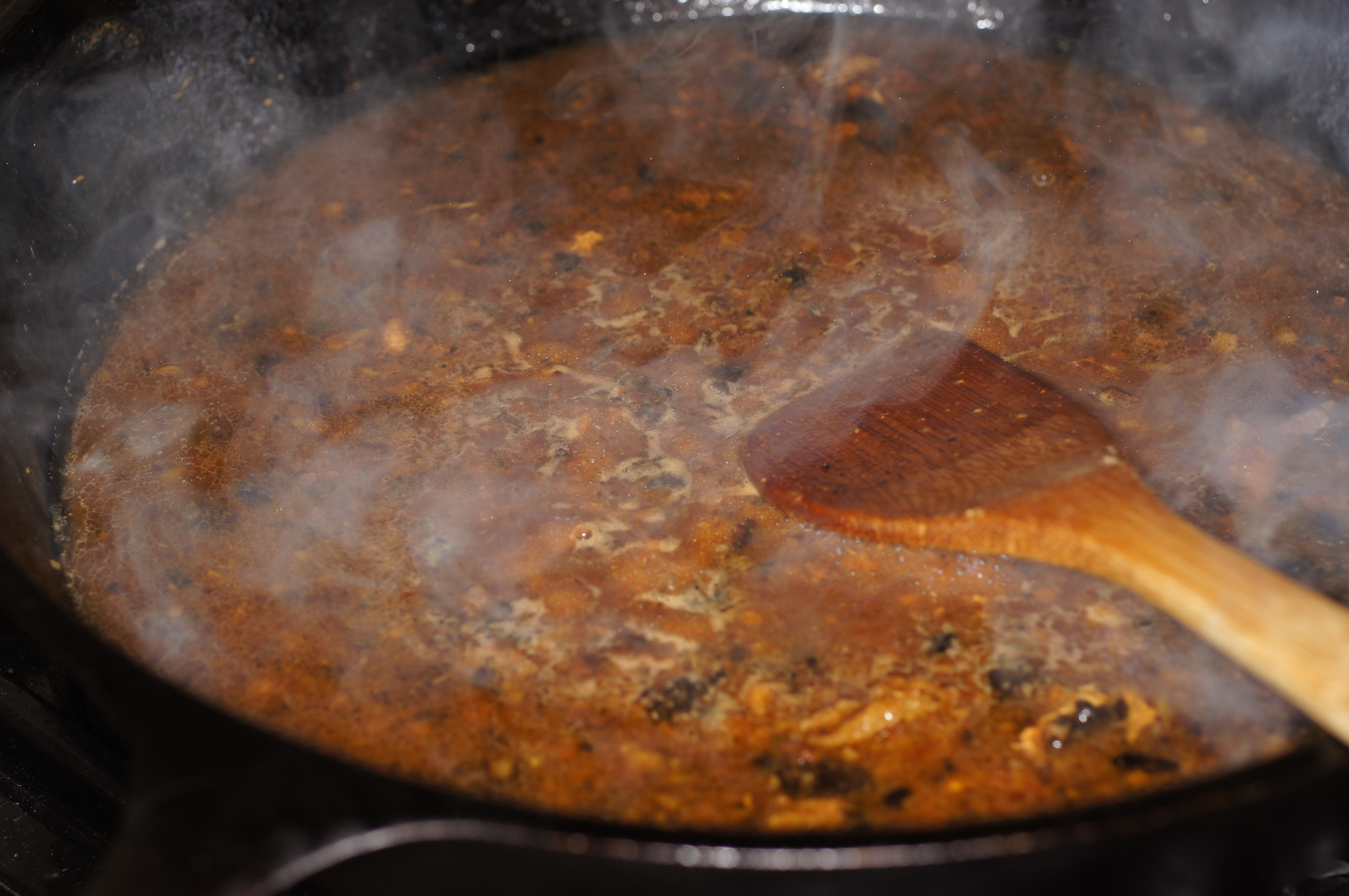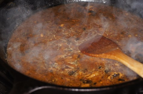 Let the chicken rest in the skillet at room temperature for a few minutes, then cut it into 8 pieces. Deglaze the cooking pan with chicken stock and red wine.