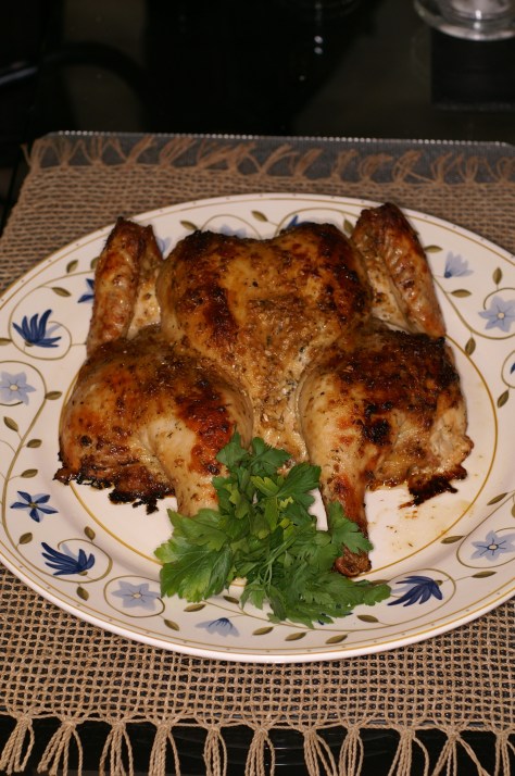 Preheat the oven to 450 degrees. Using kitchen shears or a sharp knife, cut alongside the backbone of the chicken to split it open. Spread and press on the chicken with your hands to flatten it. Using a sharp paring knife, cut halfway through both sides of the joints connecting the thighs and drumsticks and cut through the joints of the shoulder under the wings as well. (This will help the heat penetrate these joints and accelerate the cooking process.)