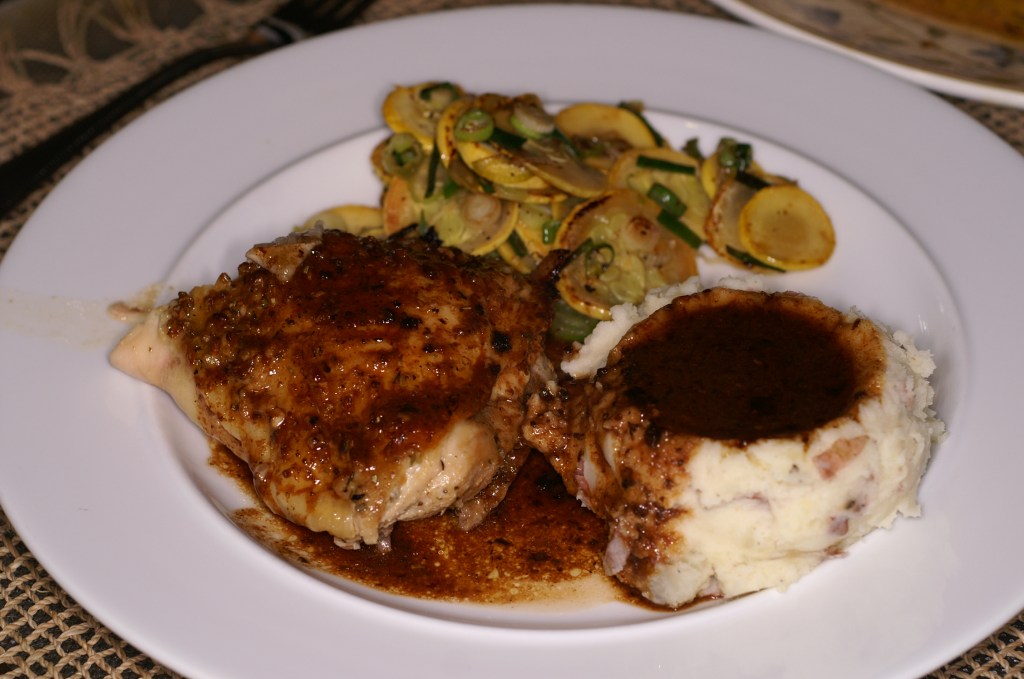 Mound some mashed potatoes on each of four warm dinner plates and place 2 pieces of chicken on each plate. Pour some juice on the mashed potatoes and chicken and serve.
