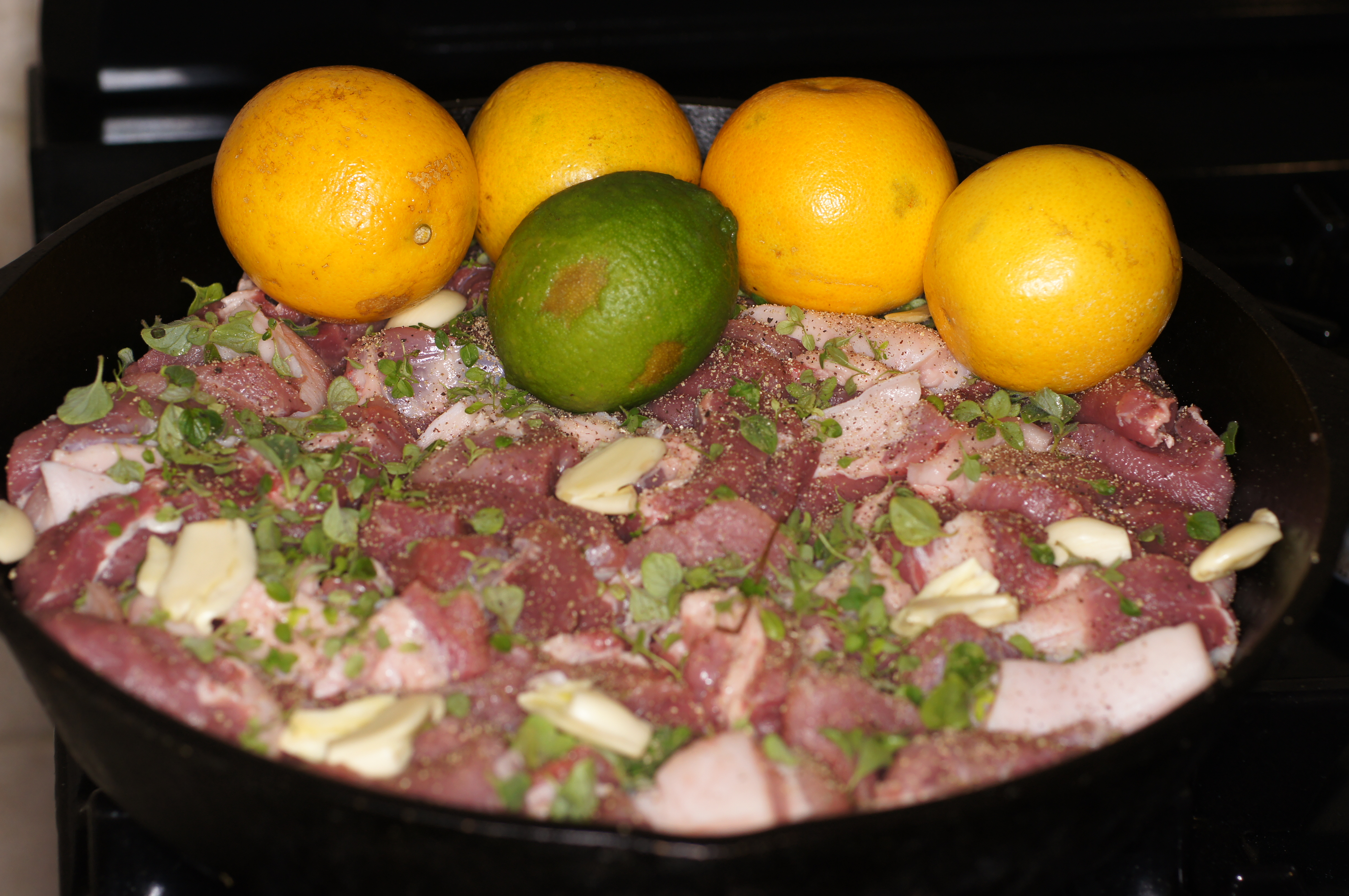 Place the pork in a large Dutch oven or heavy bottom pot (I use a 13 inch cast iron skillet). Add the orange juice, lime juice, garlic, cumin, oregano, thyme, salt and just enough water to barely cover the meat.