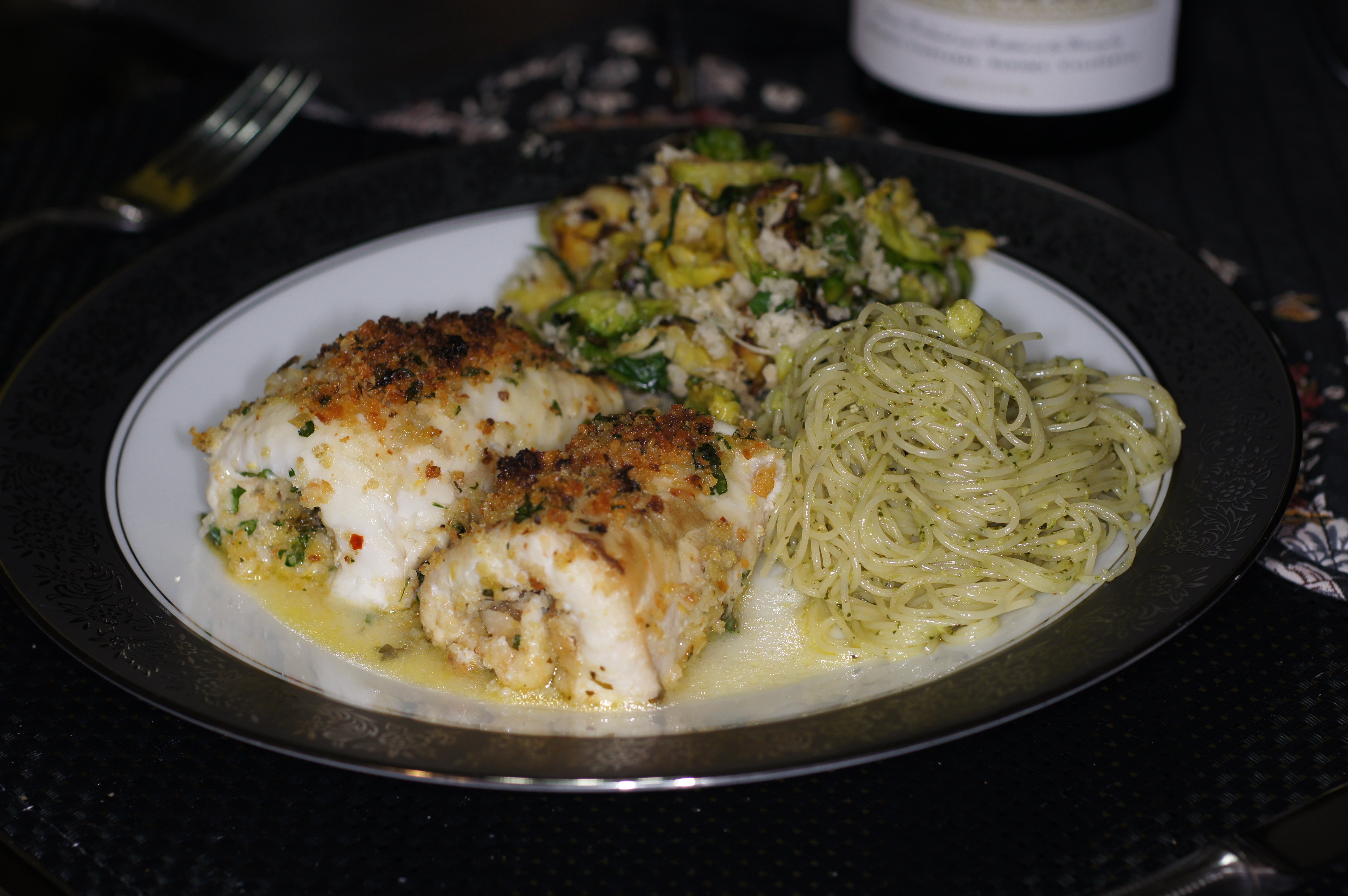 We served it with a simple angel hair pasta with basil pesto and some roasted, seasoned brussells sprout leaves with a little panko for some crunch. The flavors played off of each element wonderfully.  The lemon went with both the pasta and the brussells sprouts.  The pesto pasta mellowed the sauce and gave a creaminess to the meal while the brussels sprouts added an earthiness and a little spice.  We would both eat this again.