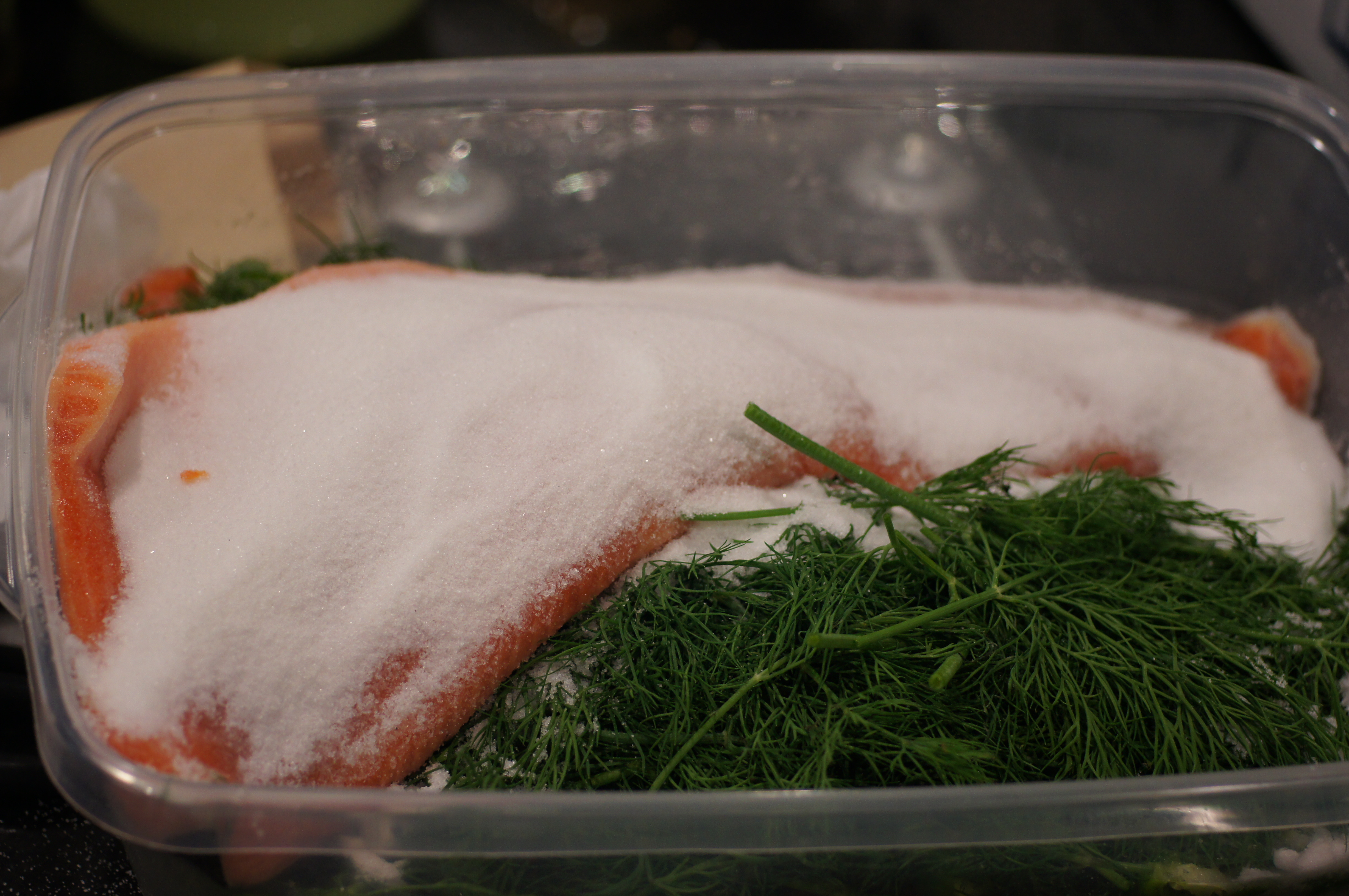 Put the fish in a container large enough to hold it and still fit in your refrigerator. Mix the salt and sugar and put in a container for use and storage afterwards. Pour 1 oz Aquavit over the steelhead and generously cover first fillet with the mix of sugar/salt mix. I prefer the sea salt because of its minerality and natural ocean taste. Remember you are salt curing the steelhead.