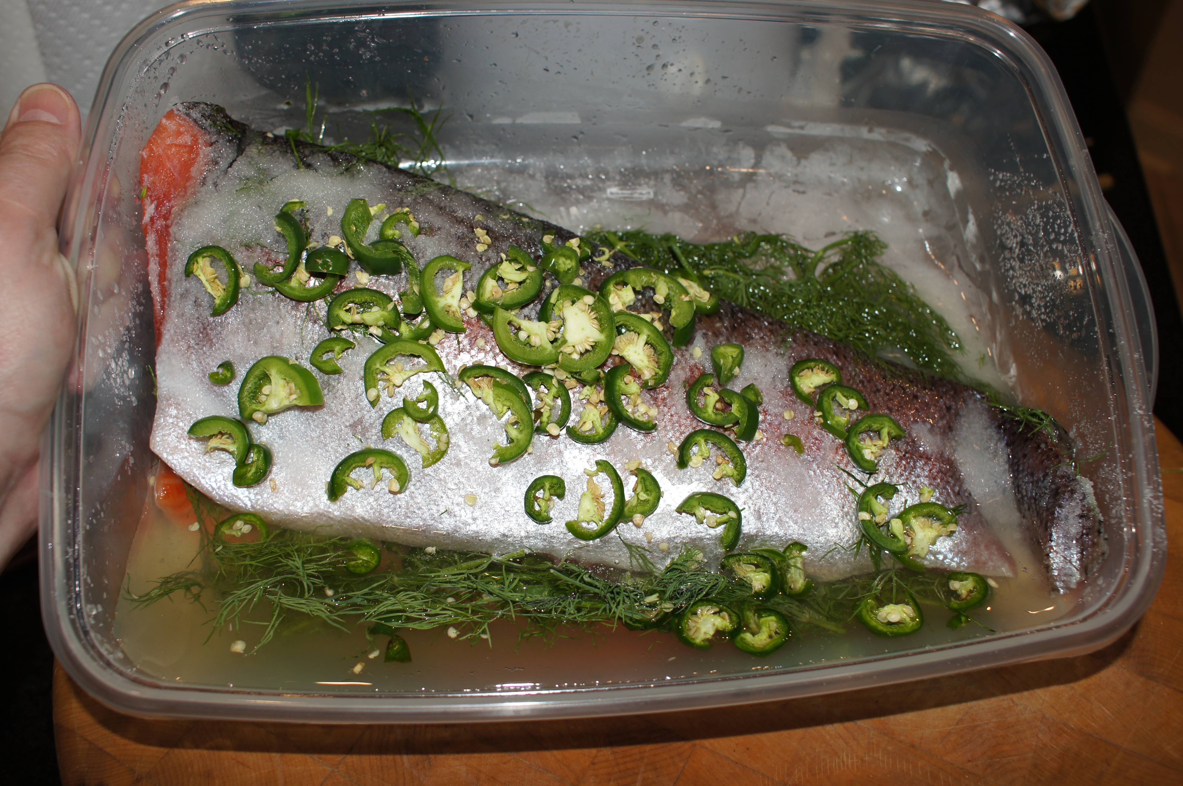 Inasmuch as Baby Lady wanted me to post the Smoked Salmon Pizza recipe, I thought it also best to post this recipe on how to make Gravlax. We put our spin on it by adding jalapeños which, obviously, are not included in traditional gravlax. 🙂 It’s pretty tasty and we hope you like it.