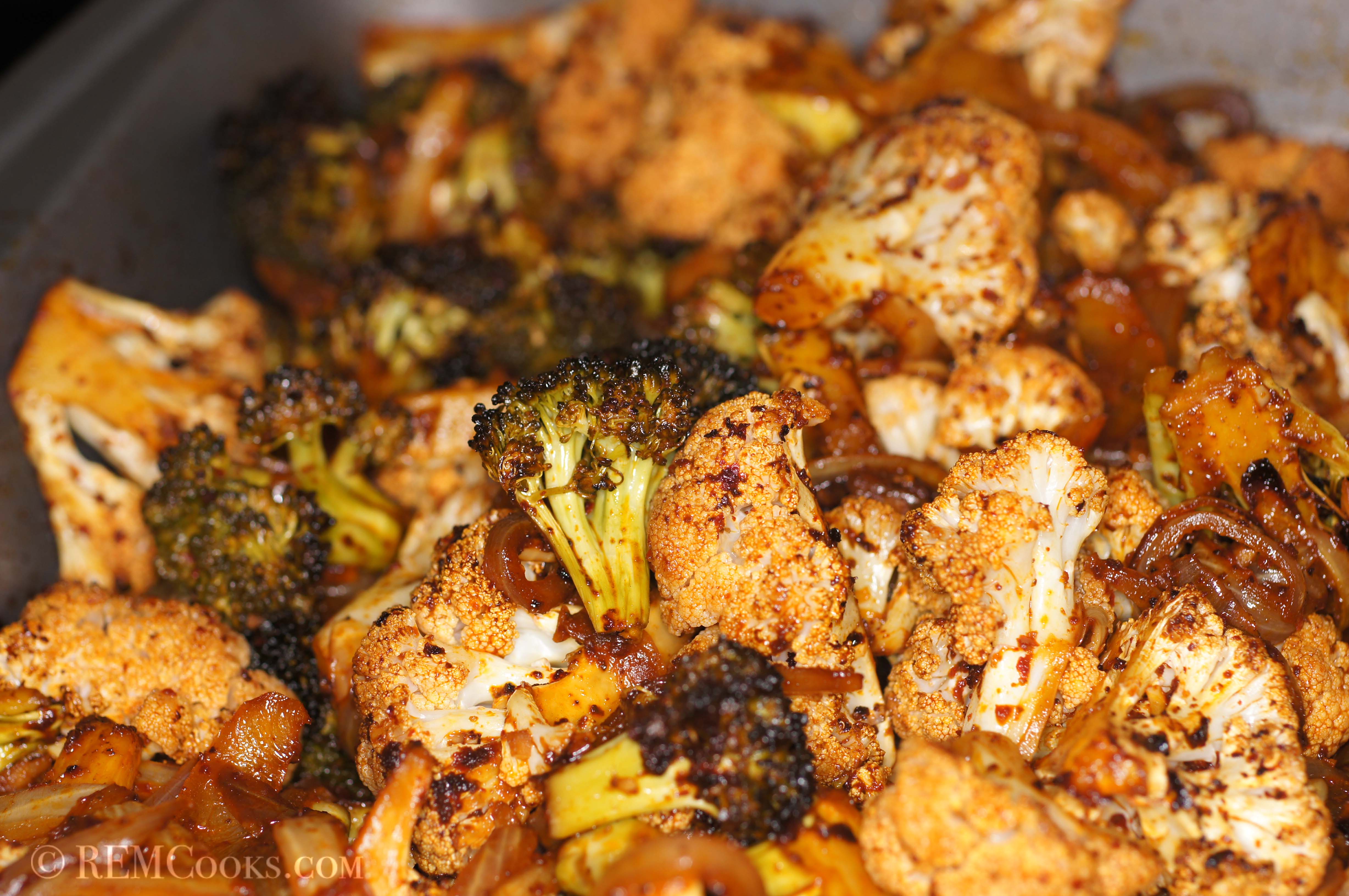 We do a variation of this recipe using a combination of broccoli and cauliflower to which we add onions, as well. The onions add a little sweetness to the dish and keep it a little more moist. The broccoli roasts beautifully and the little florets pick up the little tidbits of garlic and chile powder. Give this a try.