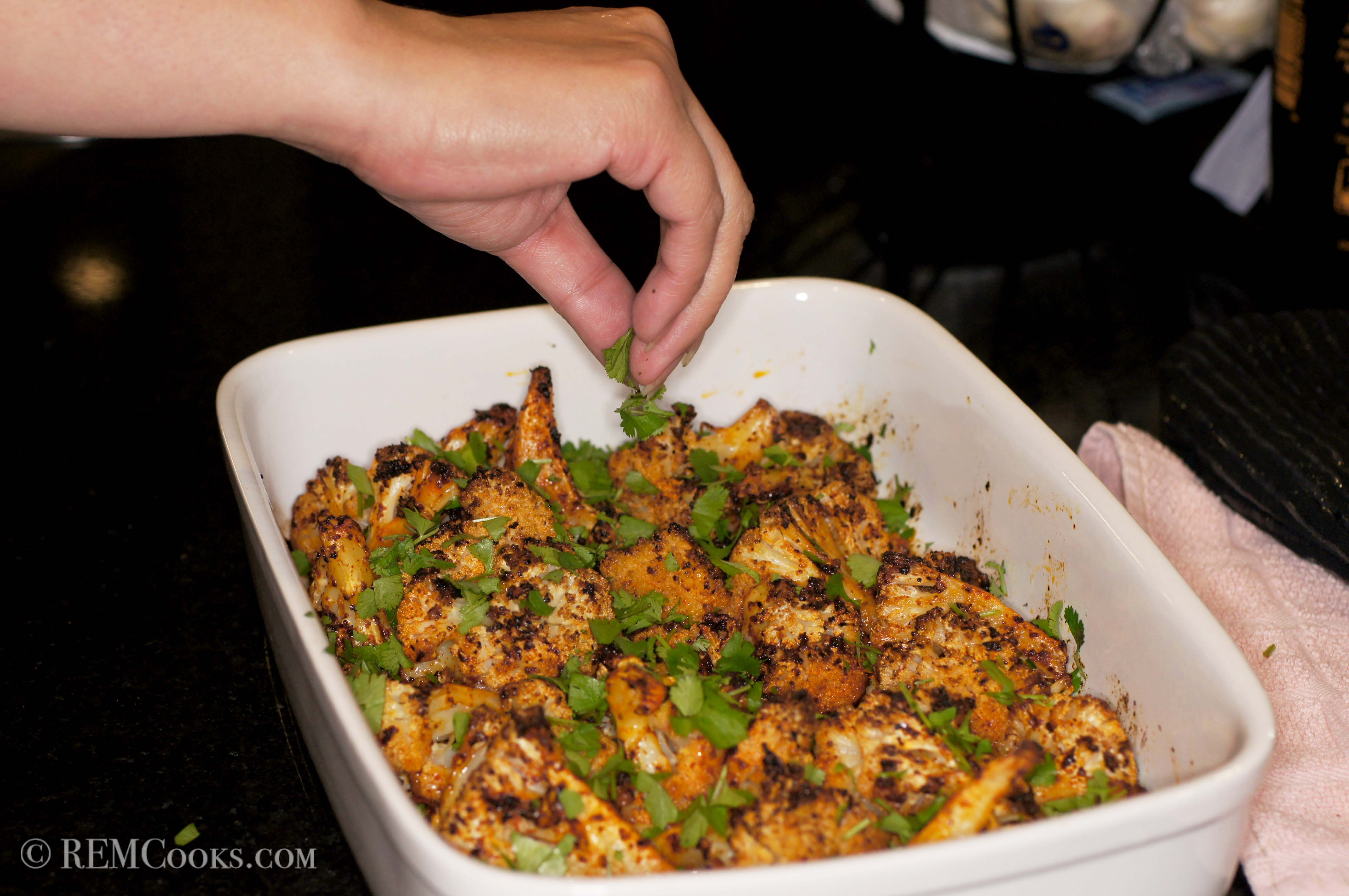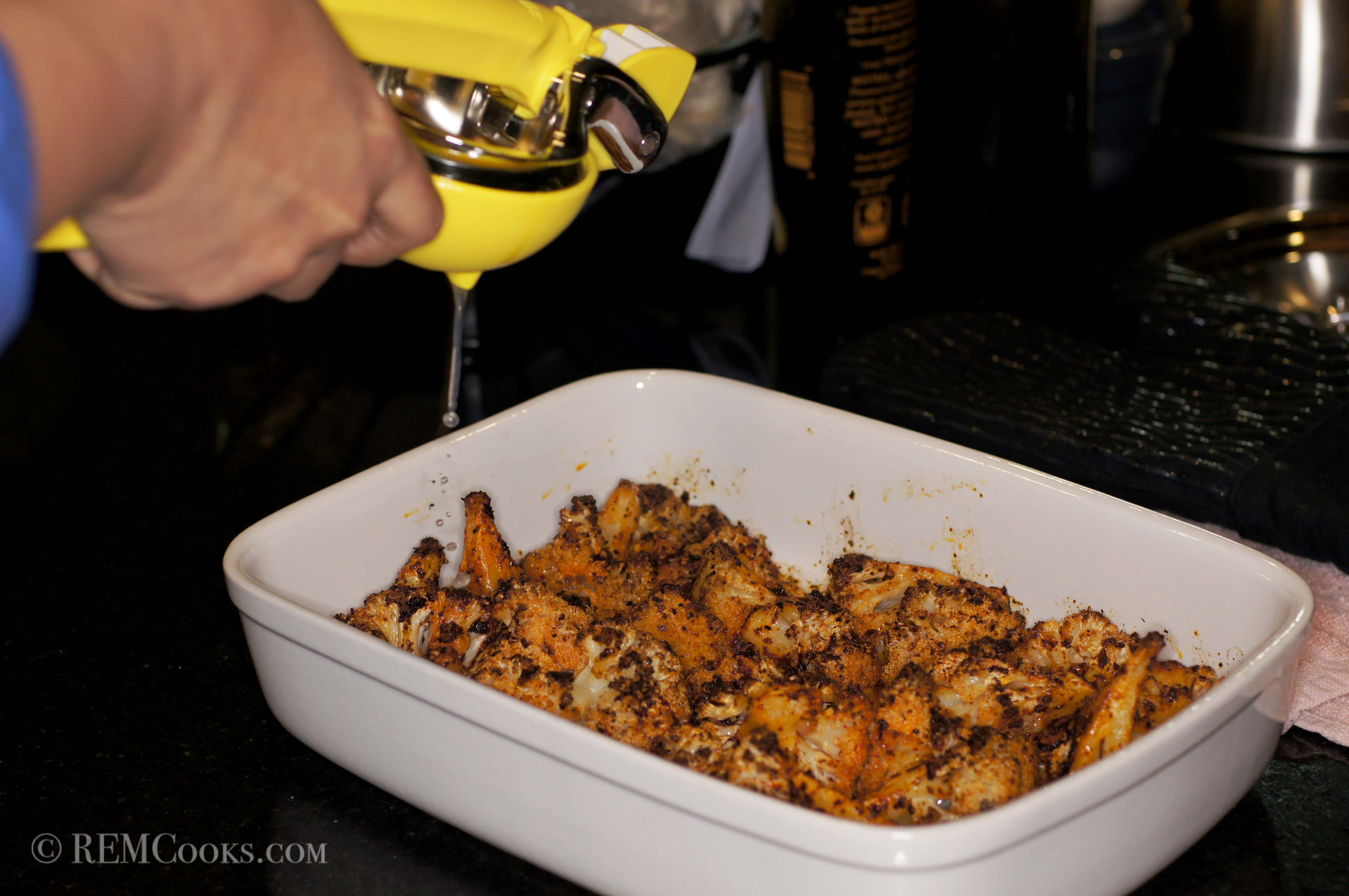 Spread the seasoned Cauliflower in a shallow roasting pan.