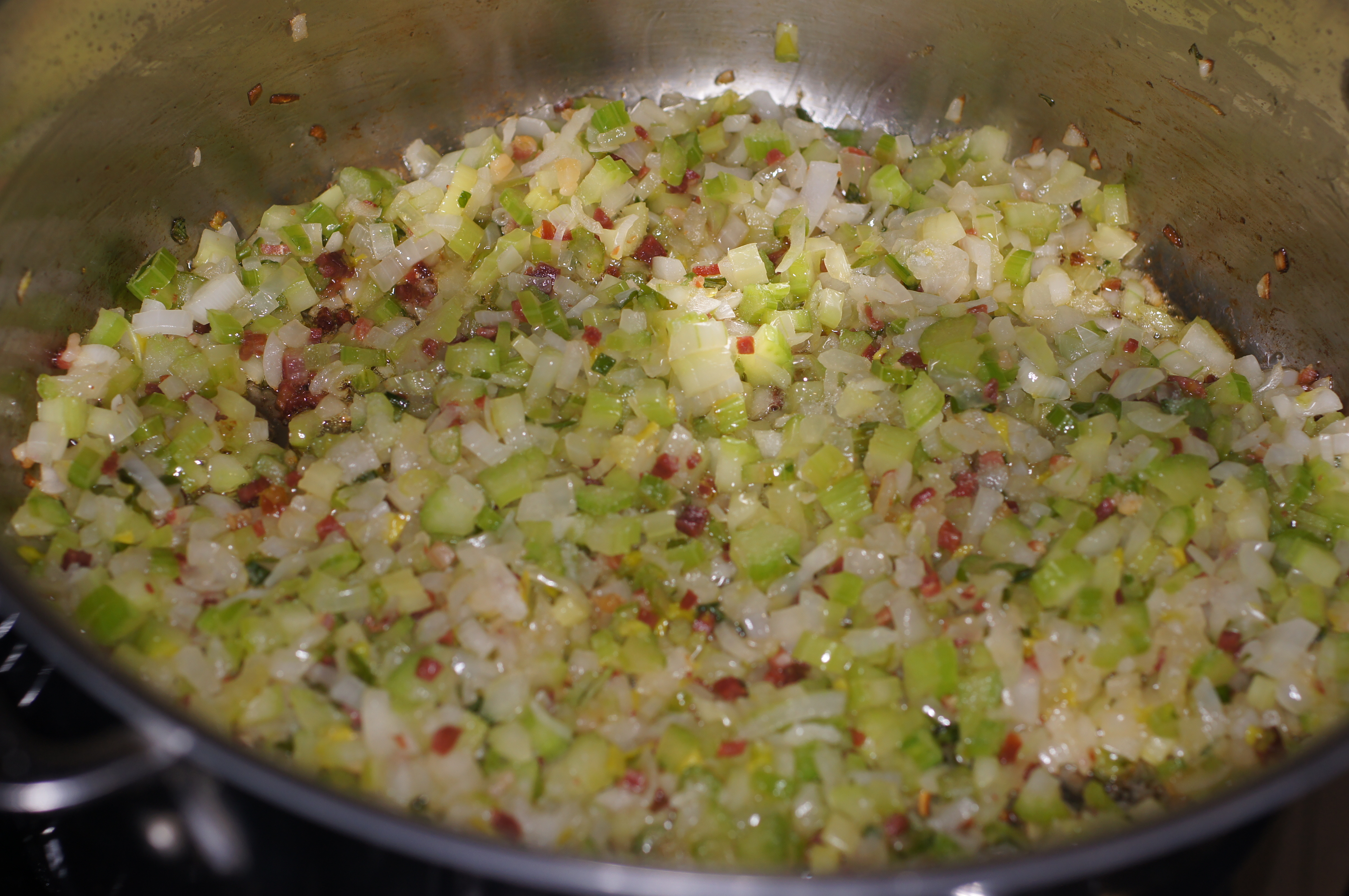 Add bacon to pot, sauté until crisp. Add onion and sweat, roughly 4 minutes. Next add celery and continue to cook.