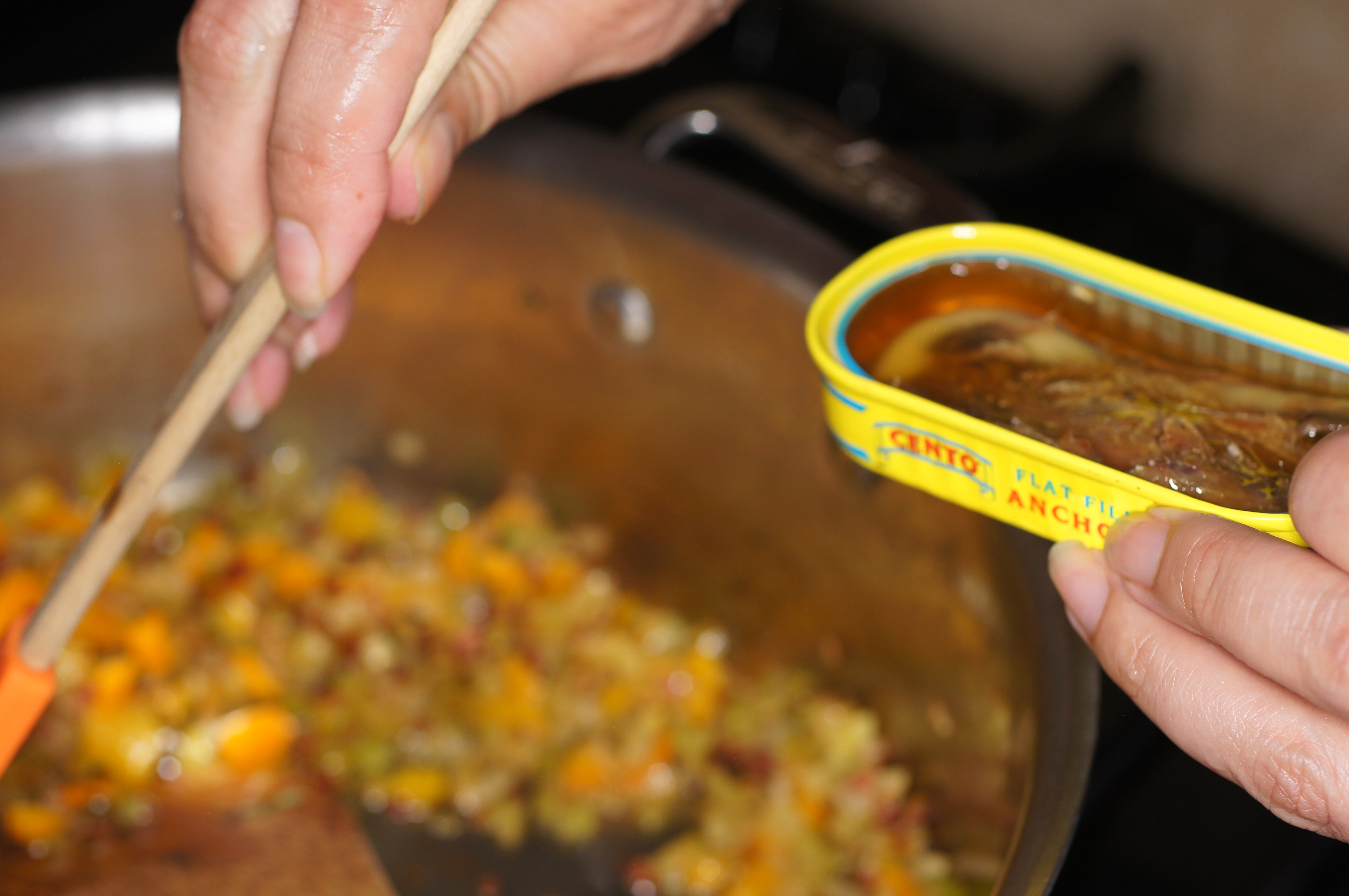 Continue to saute veggies another 2 – 3 minutes. Now add the anchovy filets and the garlic. The anchovy adds saltiness and another layer of flavor to the sauce.