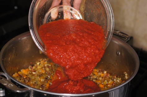 Now add the tomatoes, both crushed and diced, along with the oregano, thyme, salt and crushed red pepper.