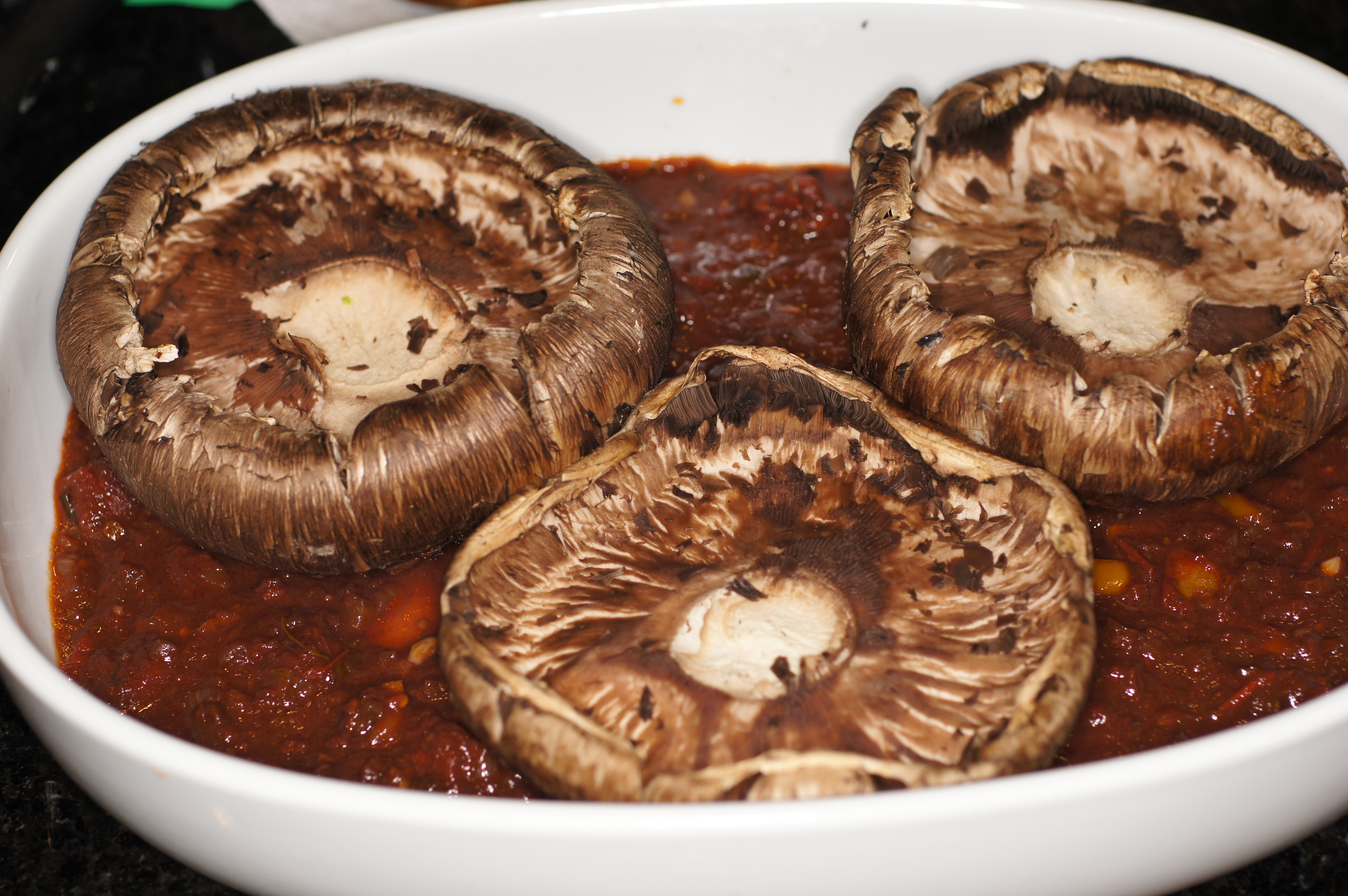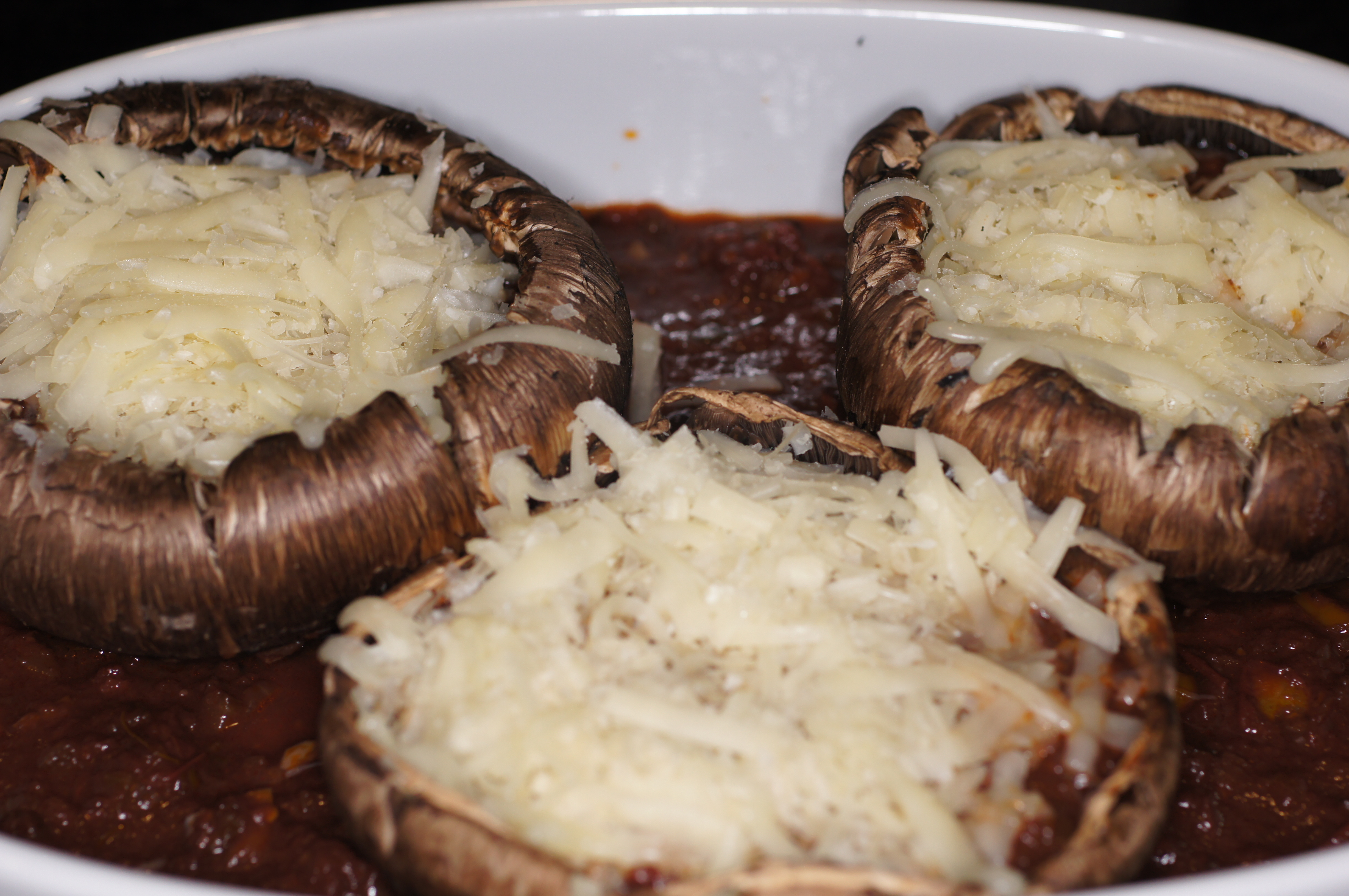 In the meantime, preheat an oven to 350 F. Blend the mozzarella and parmesan cheese. Now, stem 3 portobello mushrooms and remove all spores. On dishes like this I don’t like the spores because they have a spongey texture and turn everything black when the mushrooms release their liquid. Removing the spores provides a cleaner, meatier texture. Ladle a couple of scoops of sauce in the bottom of a baking dish to cover the bottom roughly 1/4 inch thick. Place the portobello mushrooms bottom side down on top of the sauce.
