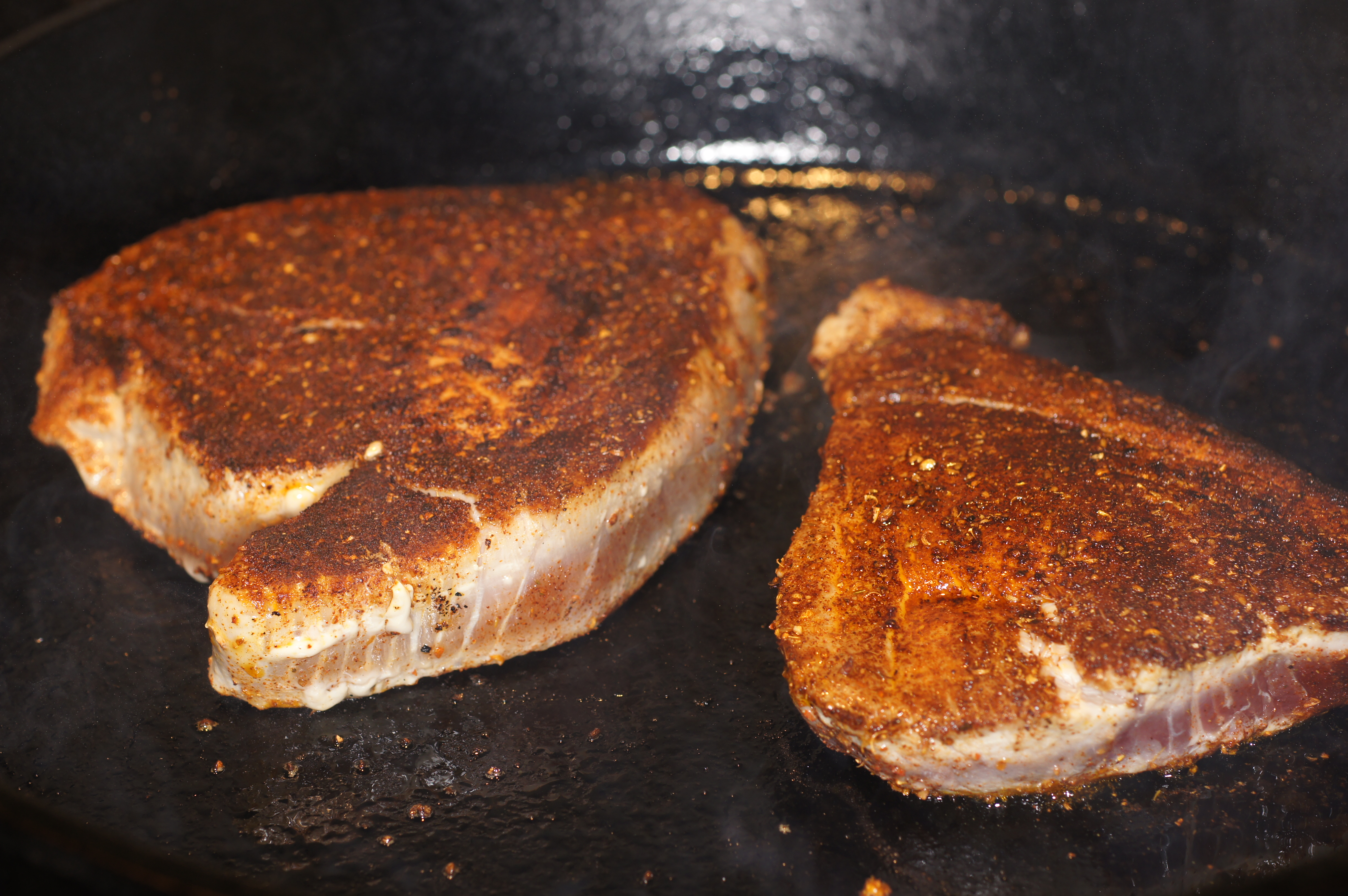 Heat a large skillet or grill on high heat. add 2 Tbsp canola oil. Sprinkle the tuna with the Ancho Seasoning until thickly coated. Place tuna filets in pan. Sear on each side roughly 40-60 seconds on each side depending upon your preference for doneness.