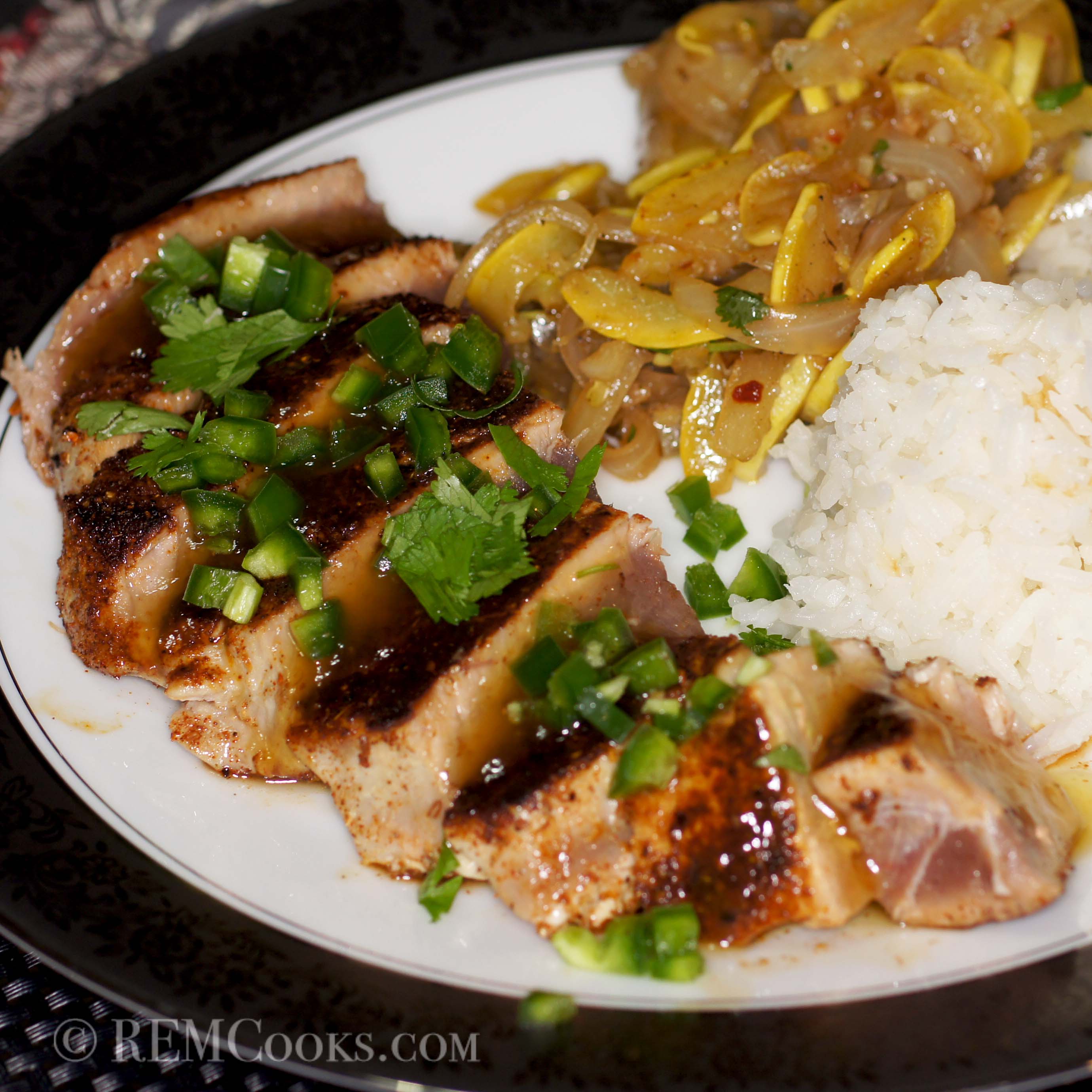 A beautiful Seared Ancho Crusted Tuna with Fig Lime Glaze and Jalapeños. The Cilantro came as an afterthought for additional garnish and flavor.