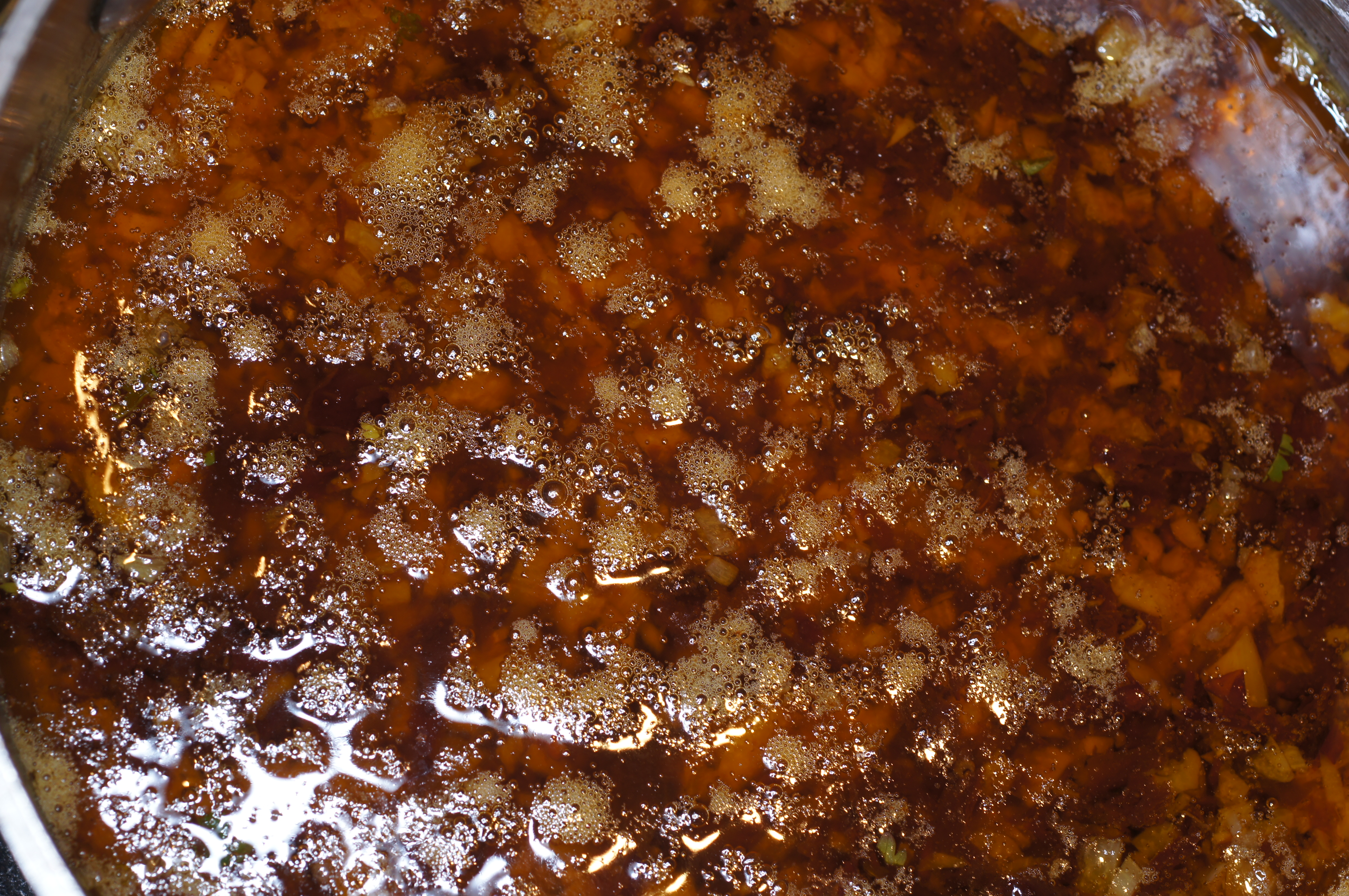 You want there to barely any movement on the surface of the oil as this is going to cook very slowly so as to produce a sweet garlic, not bitter or harsh. Once it barely reaches a simmer, reduce the heat to very lowest possible setting to keep mixture at that very gentle simmer. You should see bubbles rising in the pot like like very fine champaign, small bubbles every so often.