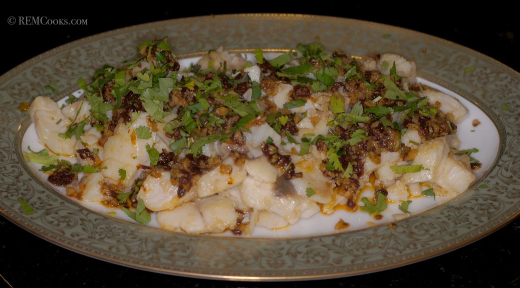 3.       Put the fish onto a deep serving platter. Repeat steps for cooking the remaining ½ of the fish adding another 1½ tablespoons of the garlicky oil. When all the fish is cooked, use a slotted spoon to scoop out the warm bits of garlic and chiles from the pan and pour them over the fish. Top with chopped cilantro.