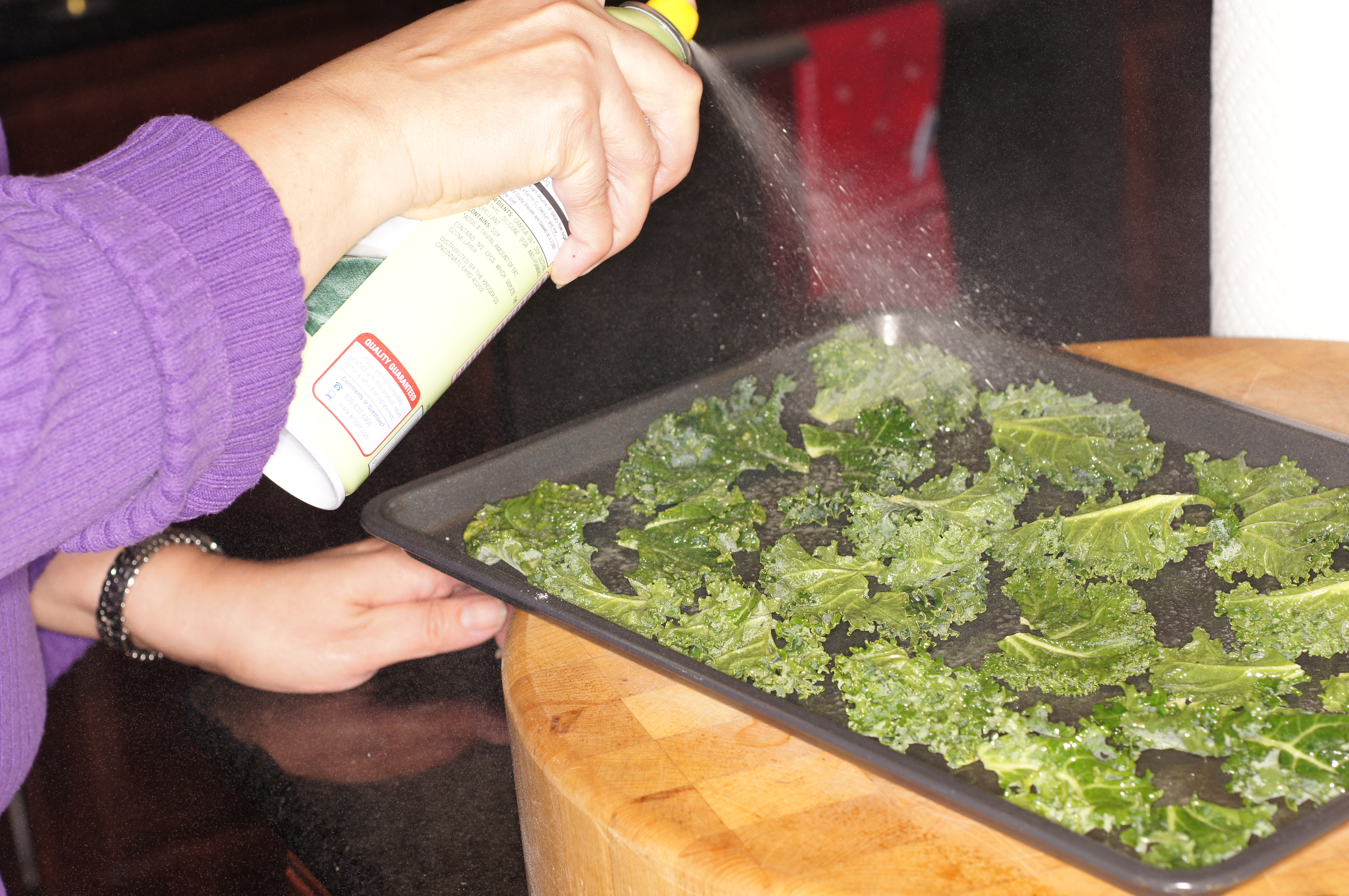 Prepare a baking sheet by spraying Pam on sheet and seasoning the pan with salt and pepper so as to transfer to the kale. Next, lay kale pieces flat on a baking sheet and spray lightly with Pam and season with salt and red pepper flakes.