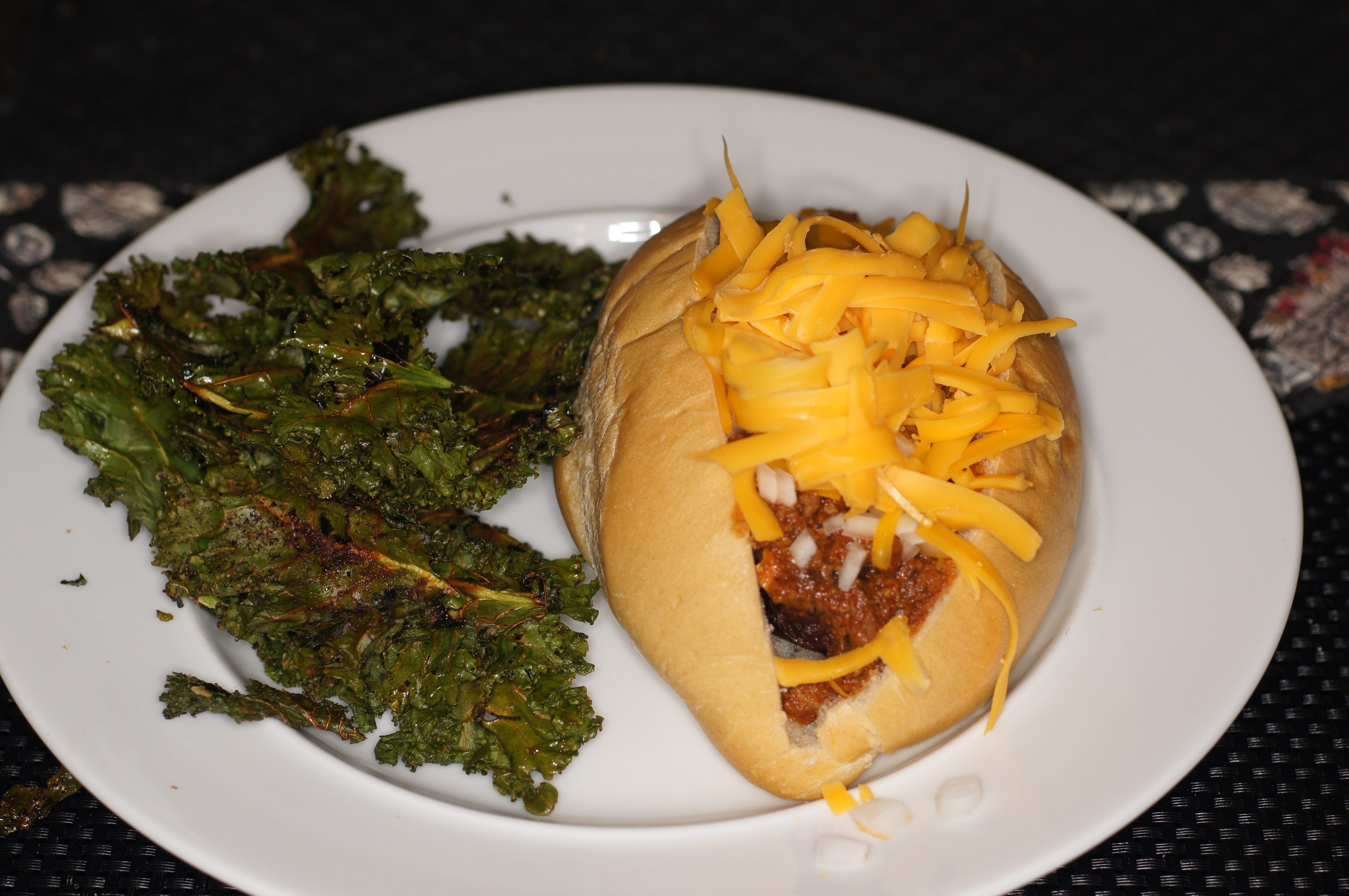 We like chips but they are sooo high in calories, fats, not to mention transfats. We are always looking at substitutes with varying degrees of success. Baby Lady saw these and wanted to try them. So we did with a beautiful Chili Dog with an Oma Jalapeño Cheese Sausage on a Francesitos (Mexican Style French Rolls), with Super Bowl Chili-Texas Style, onions and a nice sharp cheddar cheese (Inasmuch as this dinner was a heart attack waiting to happen, we needed something healthy). Before I could post the recipe, we went on vacation (which was wonderful). I did, however, post a photo of the chips and dog on Facebook for our friends. Our friend Doug saw the photo and has been asking for the recipe for Kale Chips the entire time we were on vacation because of their low calorie count and health benefits. He also likes to poke me in the eye periodically. According to Doug, everybody but him has Kale Chips. So for our friend Doug, here is the recipe. They are really simple to make, have good flavor and a nice crunch to satisfy your crunchy craving.