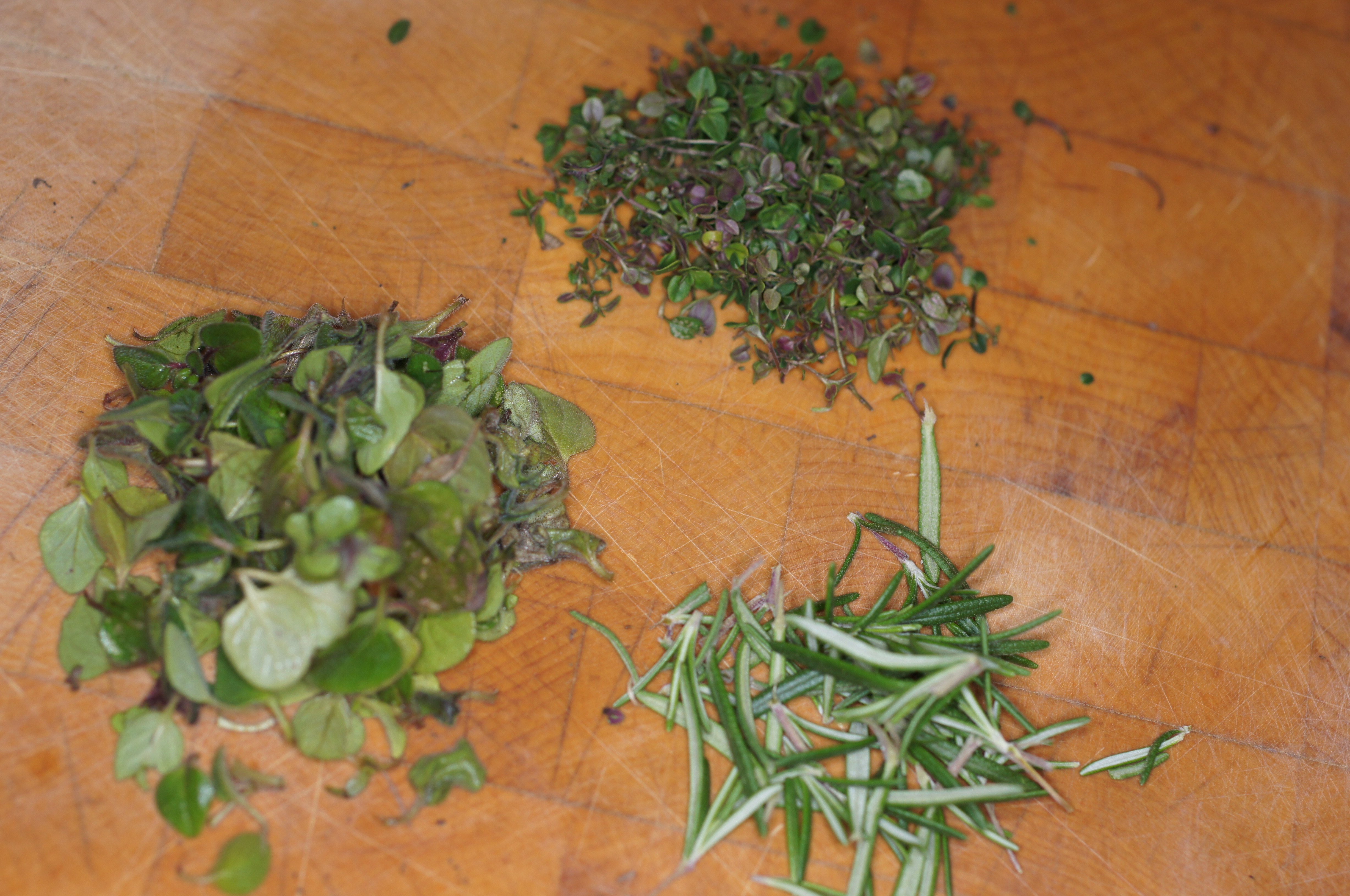 Once appropriately cut into individual pieces, we have to figure out what we are fixing for dinner. Thankfully, it’s fish so it won’t take long. After discussing the matter with Baby Lady, we decided a garden dinner was the way to go. Robert (Quickstep), our oldest son, went to the family market and harvested some oregano, thyme and rosemary.
