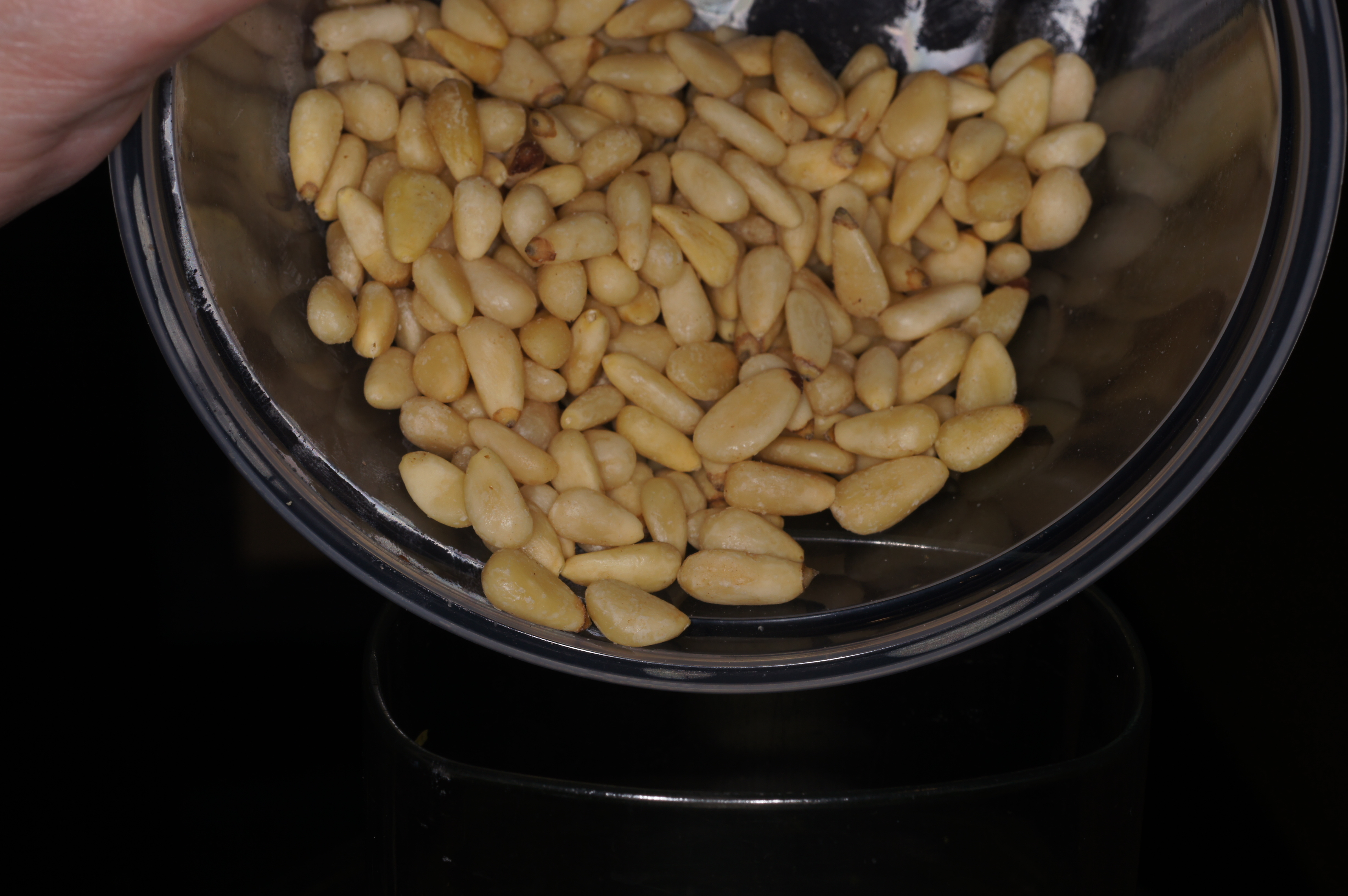 Pulse again to incorporate. Now, add the olive oil while the food processor is running to fully incorporate and puree the mixture.