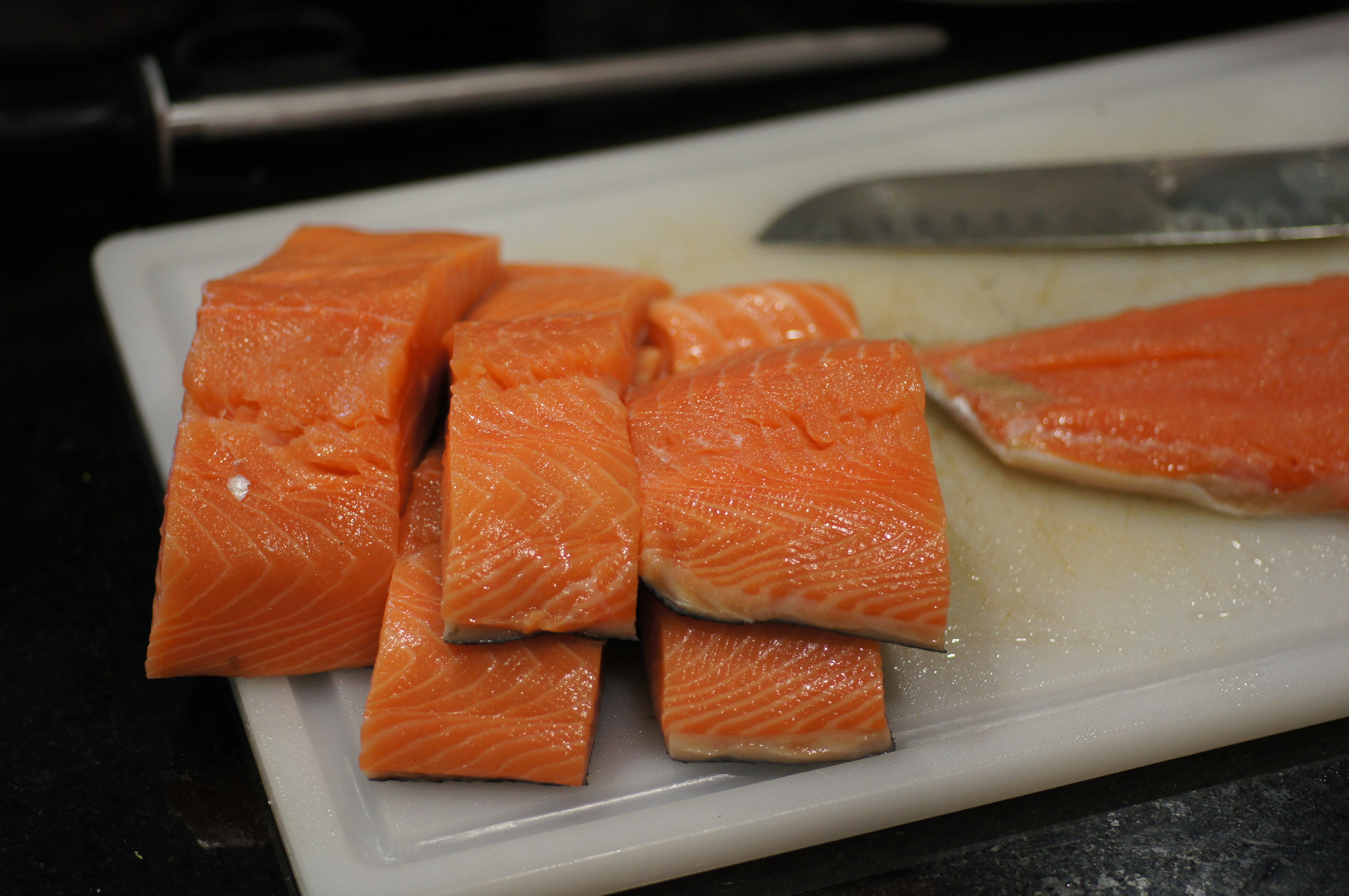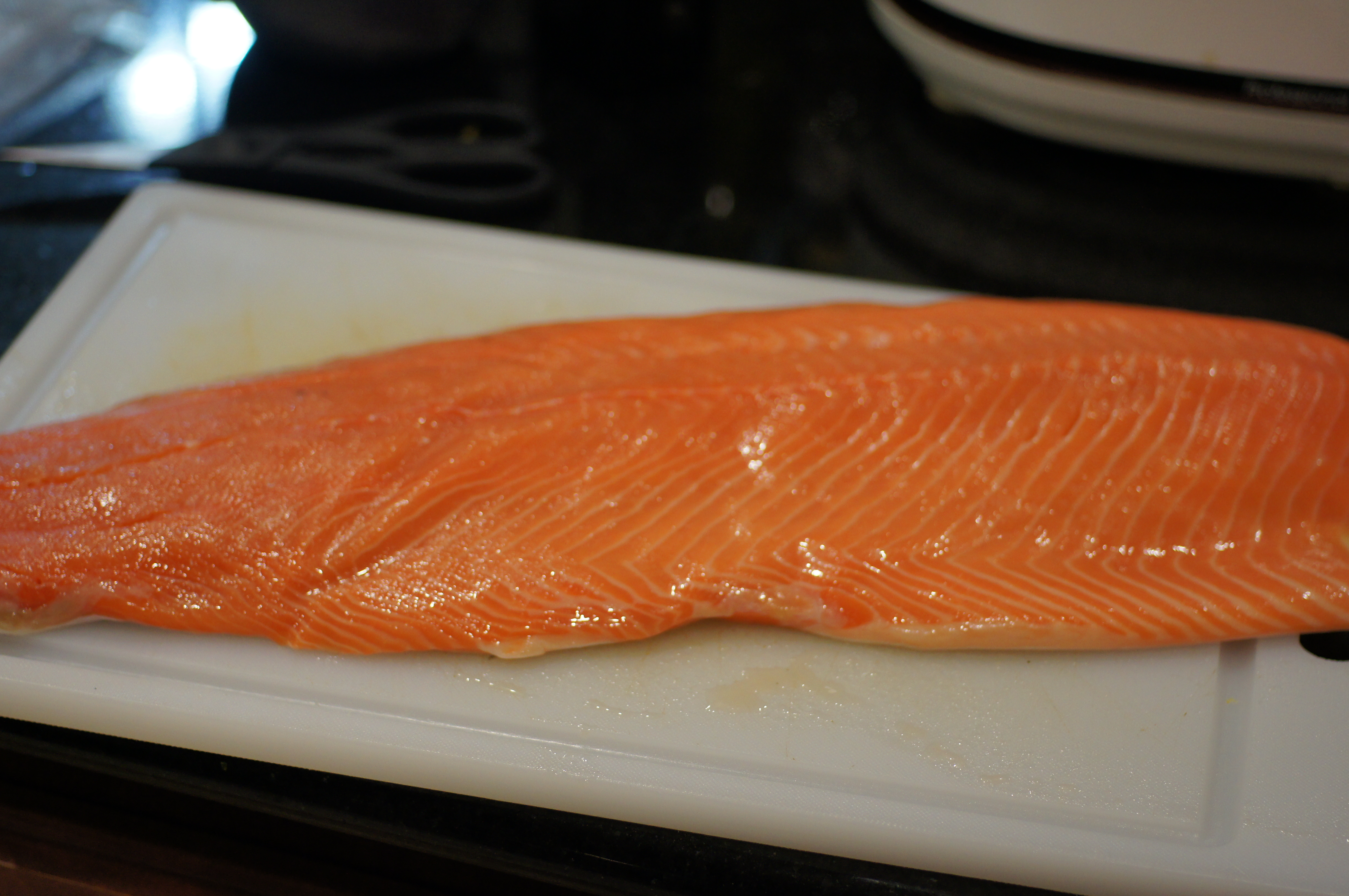 Our local market generally has an excellent supply of fish. Look at this beautiful side of Atlantic Salmon we found.