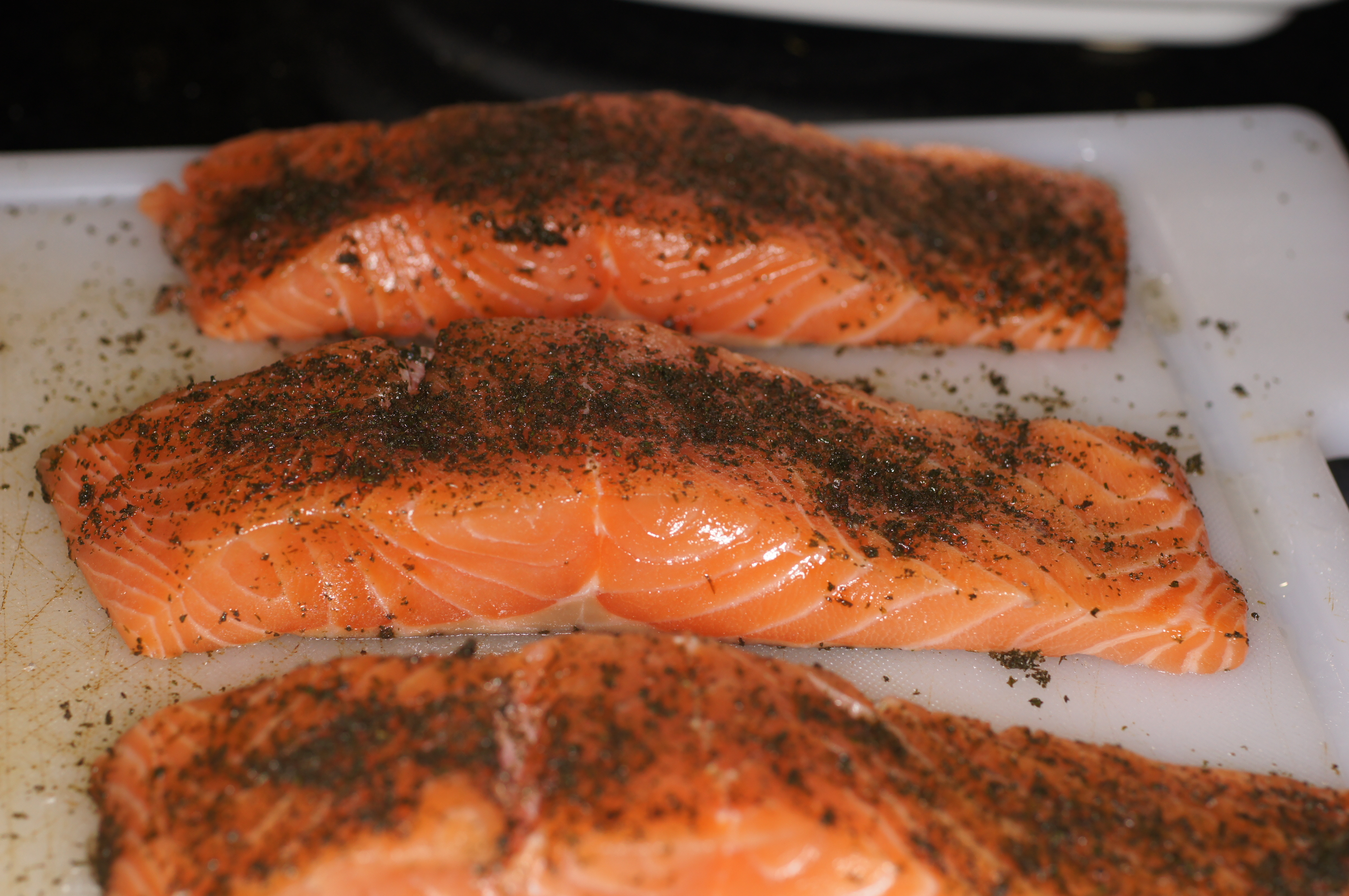 Since it’s winter, we’re growing swiss chard (both red and green), arugula, lettuce, cilantro and various herbs and spices, i.e. thyme, rosemary, oregano, & sage. All of these have volunteered over the last several years, are unbelievably hardy and packed with flavor. Every cook needs a little patch of earth to grow their own herbs and spices, but I digress. We’re talking about dinner, salmon to be precise.