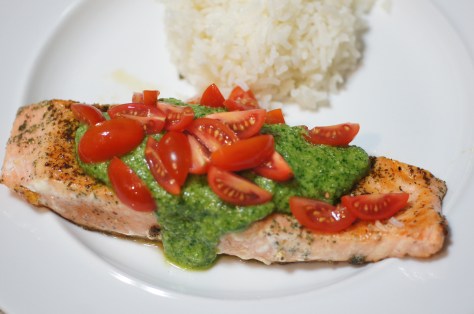 Place salmon filets on a plate. Pour 1 Tbsp of the Pistou on top of each filet and top with the quartered grape tomatoes. Serve & enjoy.