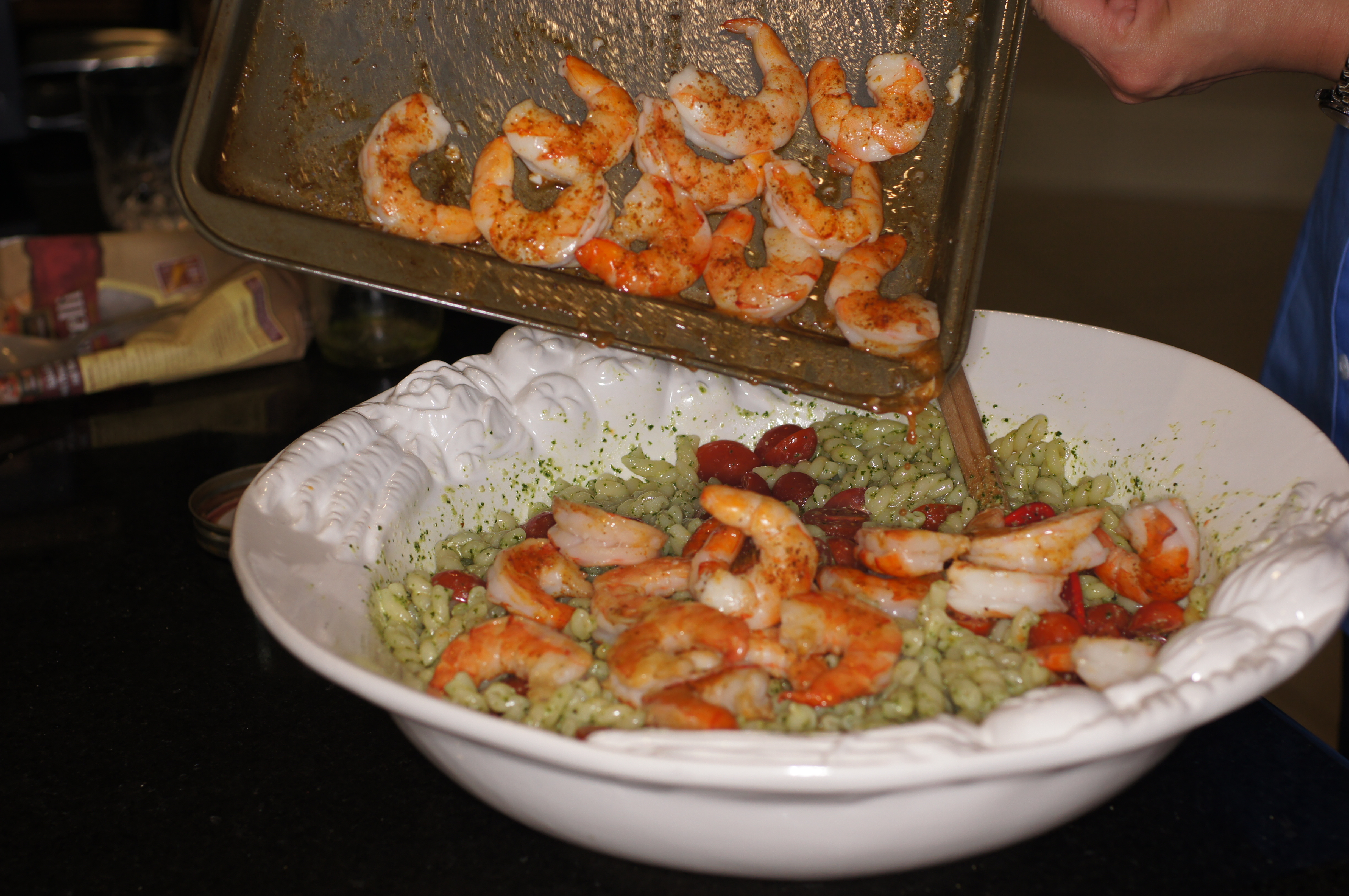 Yesterday was a busy day with lots on everyone’s mind. Quickstep has more hoops to jump through trying to get a job with the Dallas County Sheriff’s Office. Baby Lady is busy at work. I’m getting ready to do some work related travel and watching some things unravel. Not a cooking kind of day at all because everyone’s focus was elsewhere. As the evening progressed, we were all looking at each other wondering what to have for dinner and it was getting later and later. We asked Quickstep what he wanted for dinner. He said “one of them chicken pot pies” because we had roasted and deboned 2 chickens on Monday. Given the hour and the time needed to make the dough, let it rest, etc., etc., etc., we politely explained that wasn’t an option. Finally, Quickstep looked at us and said “Why don’t you cook that shrimp pasta thing you do?” We do several so we asked which one, to which he responded “That green one.” We chuckled. You see, Quickstep doesn’t really like to cook and never really pays attention to the fancy names we throw around for what we are feeding him. He just remembers what he likes. One of the things he likes is pesto or pistou. He loved the Herb Crusted Salmon with Citrus Arugula Pistou and Grape Tomatoes we had the night before and we had 1-1/2 cups of Citrus Arugula Pistou left over. So, this was a grand idea. This makes an elegant meal that is simple and takes less than 30 minutes to make, including making the pistou. If you already have the pistou, you can have dinner in around 15 – 20 minutes. It’s perfect for weeknight meals. Give this a try.