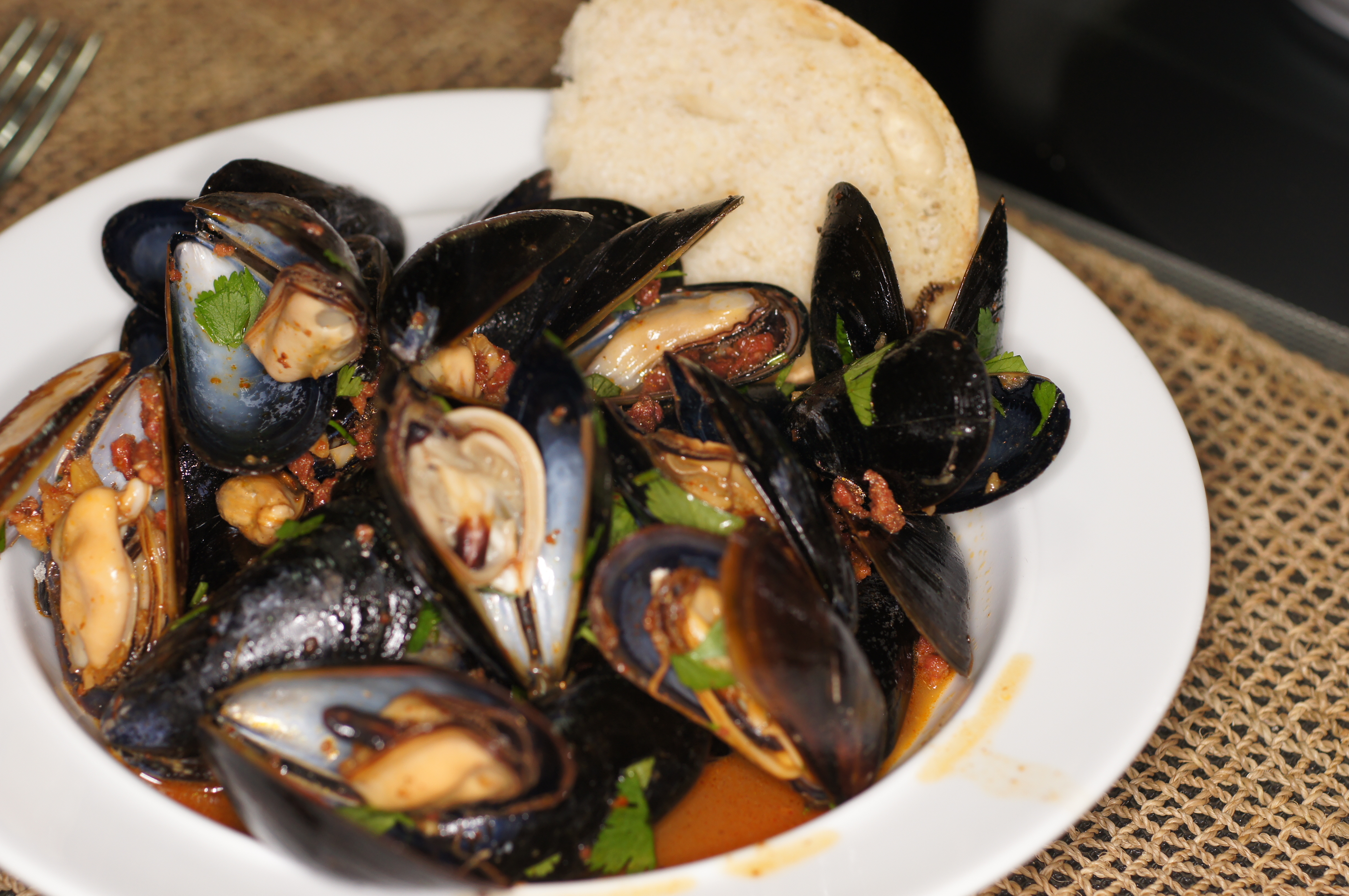 Mussels with Chorizo & Red Chiles (Mejillones con chorizo al vapor en 6 chiles)