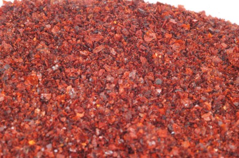 Make the coarse chile powder. Heat the oven to 325 degrees. Spread the stemmed, seeded chiles on a baking sheet, slide into the oven and bake until toasty smelling, nearly crisp, even a little browned, 5 to 8 minutes depending on the fresh moistness of the chiles. Cool the chiles. They should completely crisp as they come to room temperature. In small batches in an electric spice mill, grind the chiles. When done, you should come up with something that looks like this