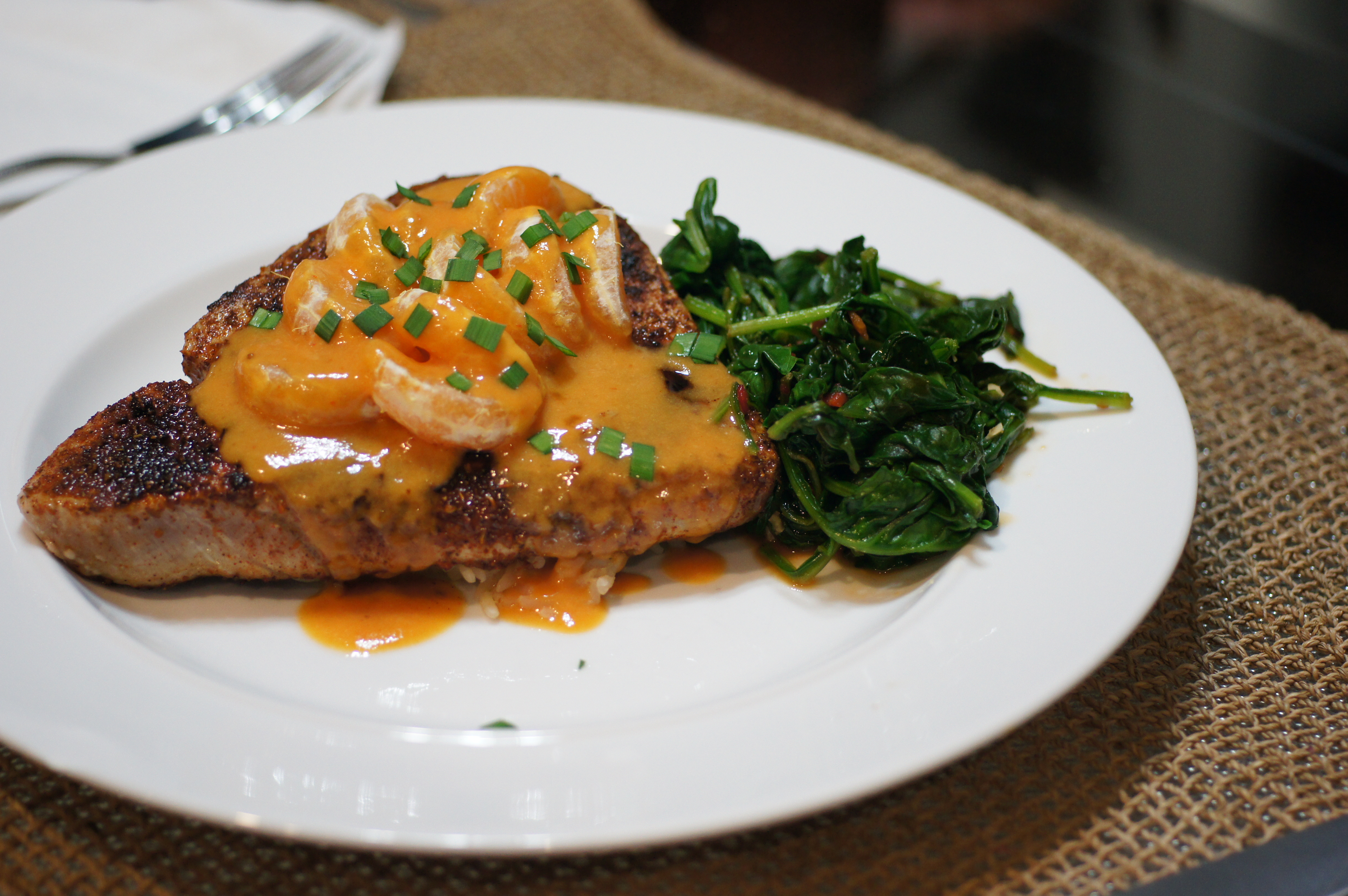 This dish was inspired by Alan Wong, celebrity chef and author of the Blue Tomato Cookbook. It came about because it’s that time of year when there is an abundance of oranges. Clementine oranges are found everywhere. We also had recently purchased some beautiful tuna steaks from our local fishmonger. We were looking for a way to change up our seared tuna and this is what we devised. It’s savory with a hint of smoke and a little spice from the chipotle and some sweetness from the Clementine. It’s quick, easy and meshes beautifully into one gorgeous meal. We hope you give it a try.