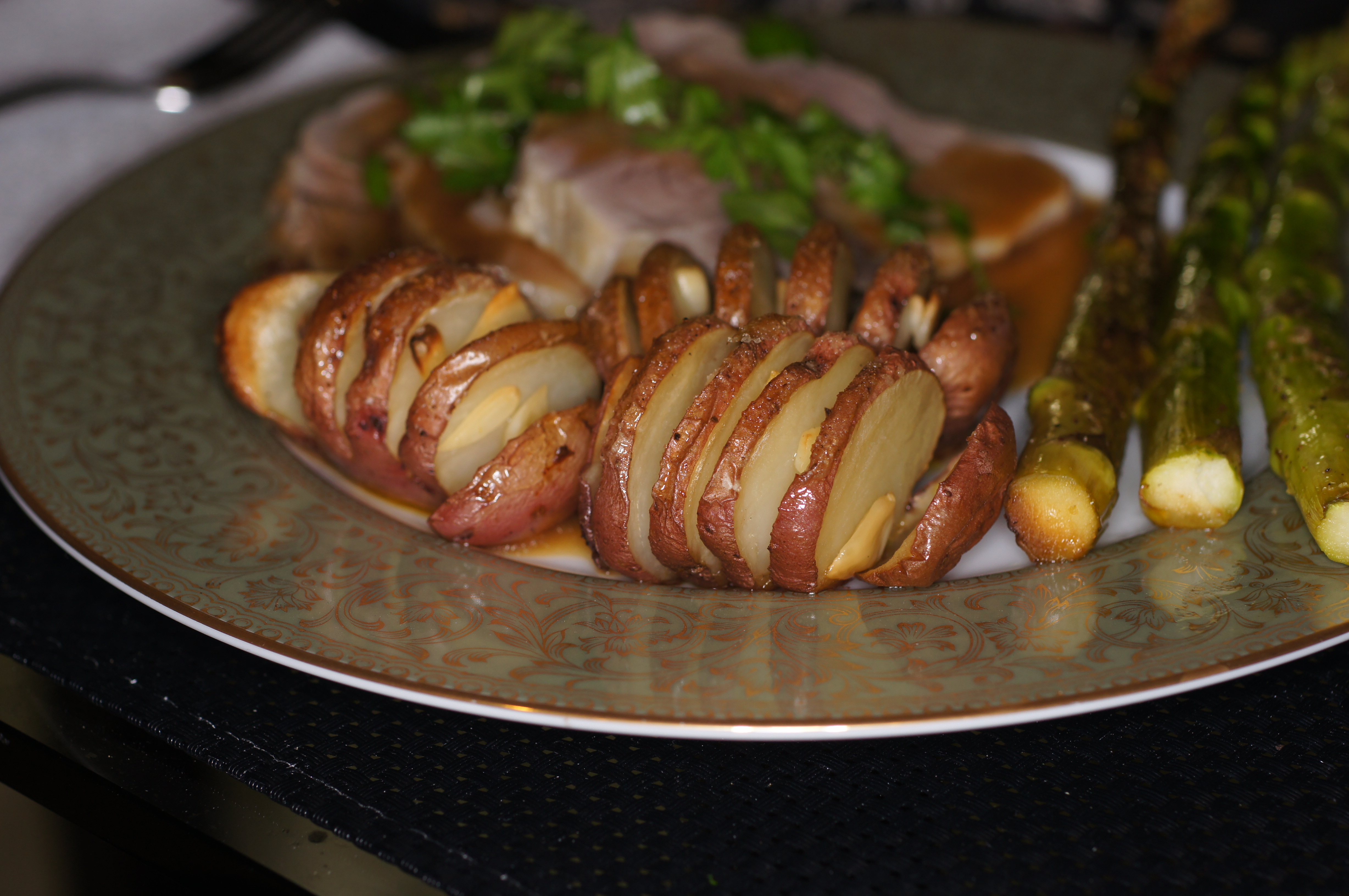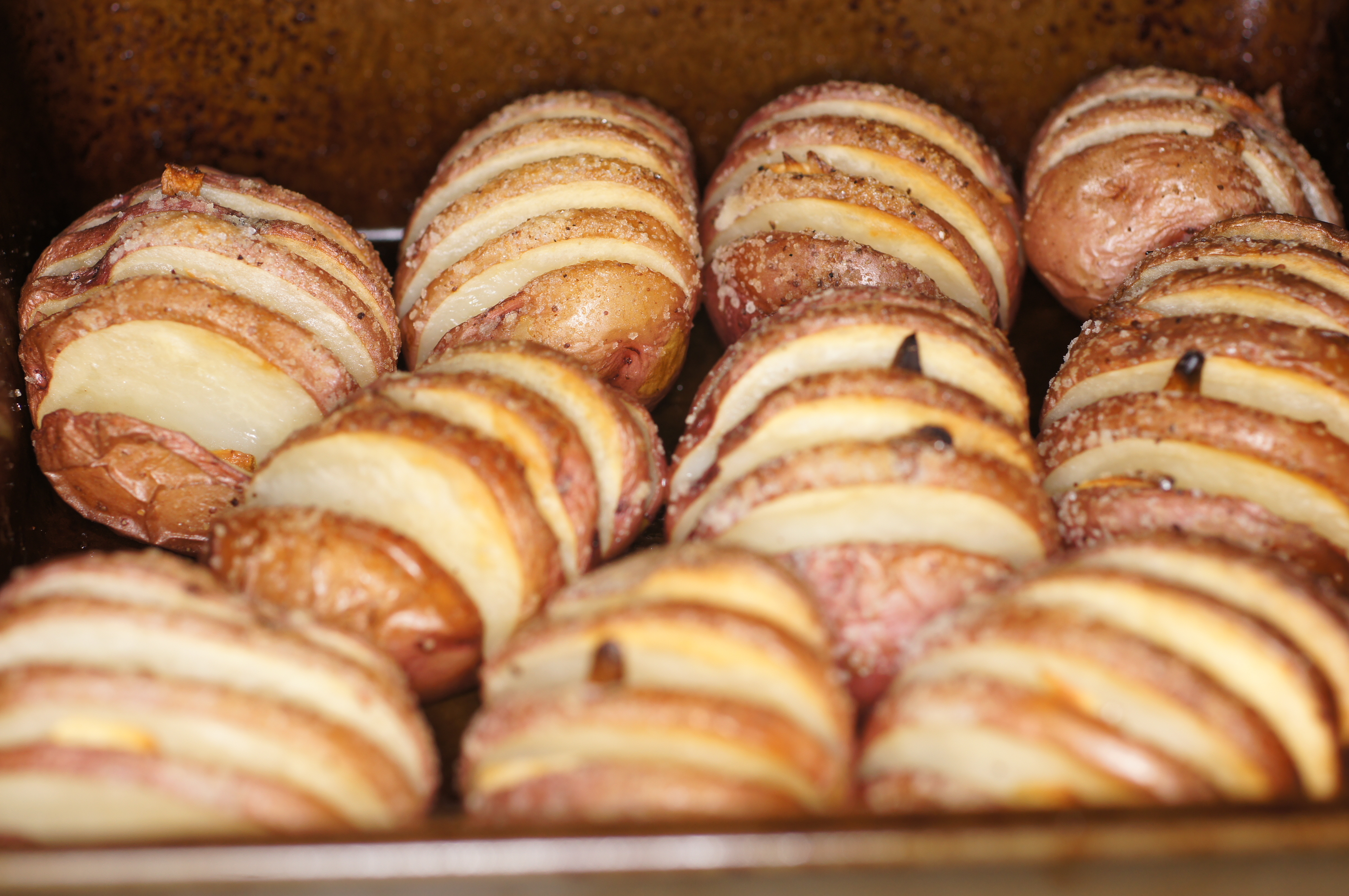 I really like Hasselback Potatoes (also known as Potato Fans). You know, the Swedish version of baked potatoes popularized as the namesake dish of the Hasselbacken Hotel restaurant in Stockholm. The problem with Hasselback Potatoes is they use 1/2 lb russets, minimum. That is a lot of food, in and of itself. We like to have a meat/protein, a vegetable/salad and a starch perhaps a little sweetness at the end. So occupying a large part of the meal in potato is just too much food. In my younger much more athletic days, 1/2 lb potato with dinner was no big deal. In fact, a 1 lb potato full of butter, salt and pepper, sour cream, cheese and chives topped with bacon crumbles was preferred. Alas, something happens when you grow older, less active and unfortunately wider. This recipe is my spin on the Sweedish classic using baby red potatoes, a small amount of olive oil misting spray, truffle salt and garlic, lots of garlic. These baby reds are perfect for an evening’s supper. Give this a try and let us know what you think.