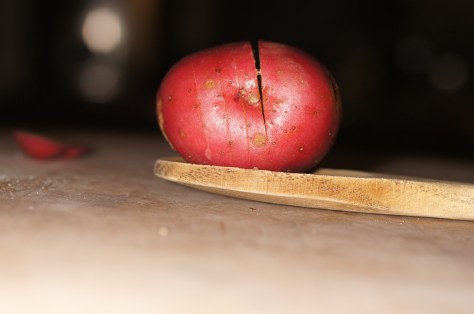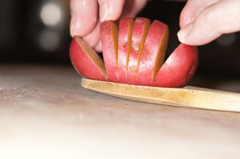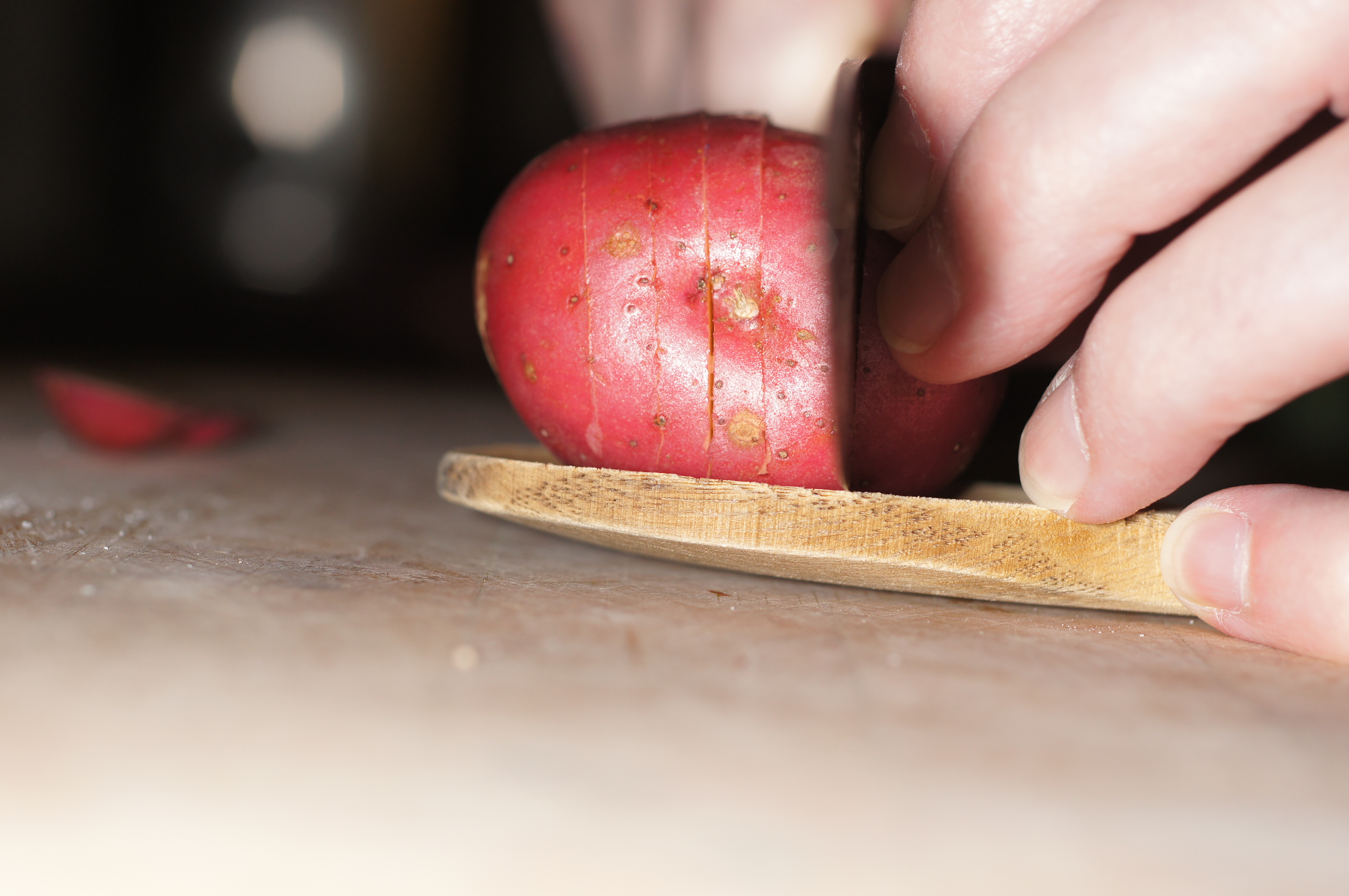 Slicing the potatoes. Get a wooden spoon (one sufficiently large enough to hold the baby red potato) and place the potato in the spoon.