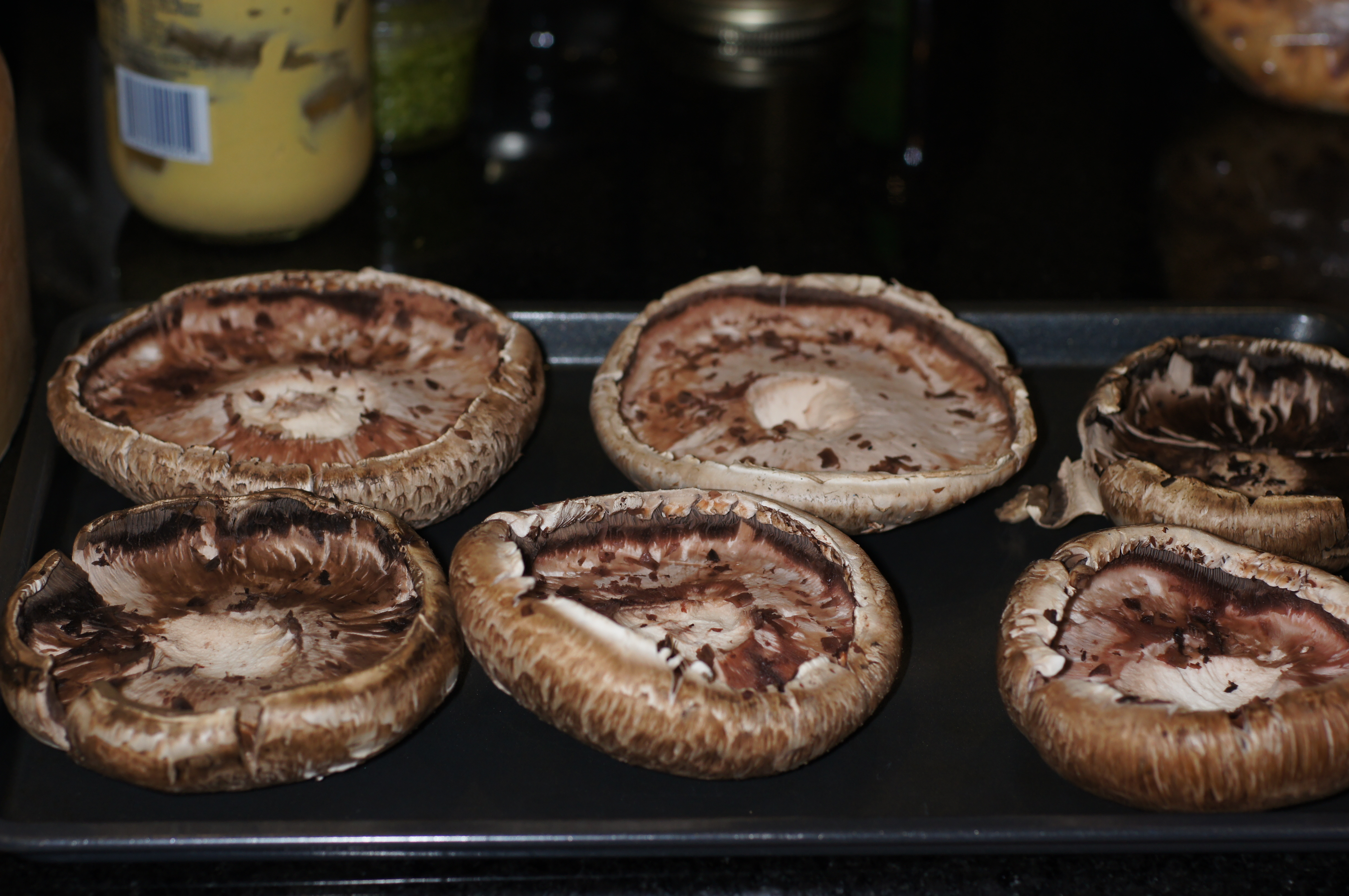 I hadn’t thought about that sandwich in years. It came to mind about a week ago as we were discussing various dishes, things to eat during the week and some beautiful portobello mushrooms at the market. We also had some frozen red sauce from a prior meal that would be just enough for the sandwich. This is my take on that bar and grill’s sandwich. The mushrooms give the sandwich body and meatiness. The Italian red sauce adds depth of flavor and character. The pesto gives the sandwich a floral quality and creaminess to go along with the provolone and parmesan cheese. This is one beautiful sandwich, even i I say so myself.