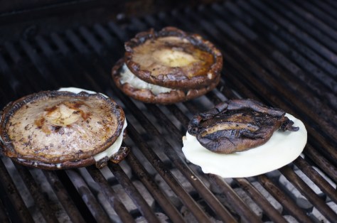 When the mushrooms have cooked, lay the mushrooms top side down on the grill. Put a slice of provolone cheese on three of the mushroom caps. Put a cap on top of each provolone cheese slice (like a double meat hamburger) and then put parmesan cheese on the top cap.