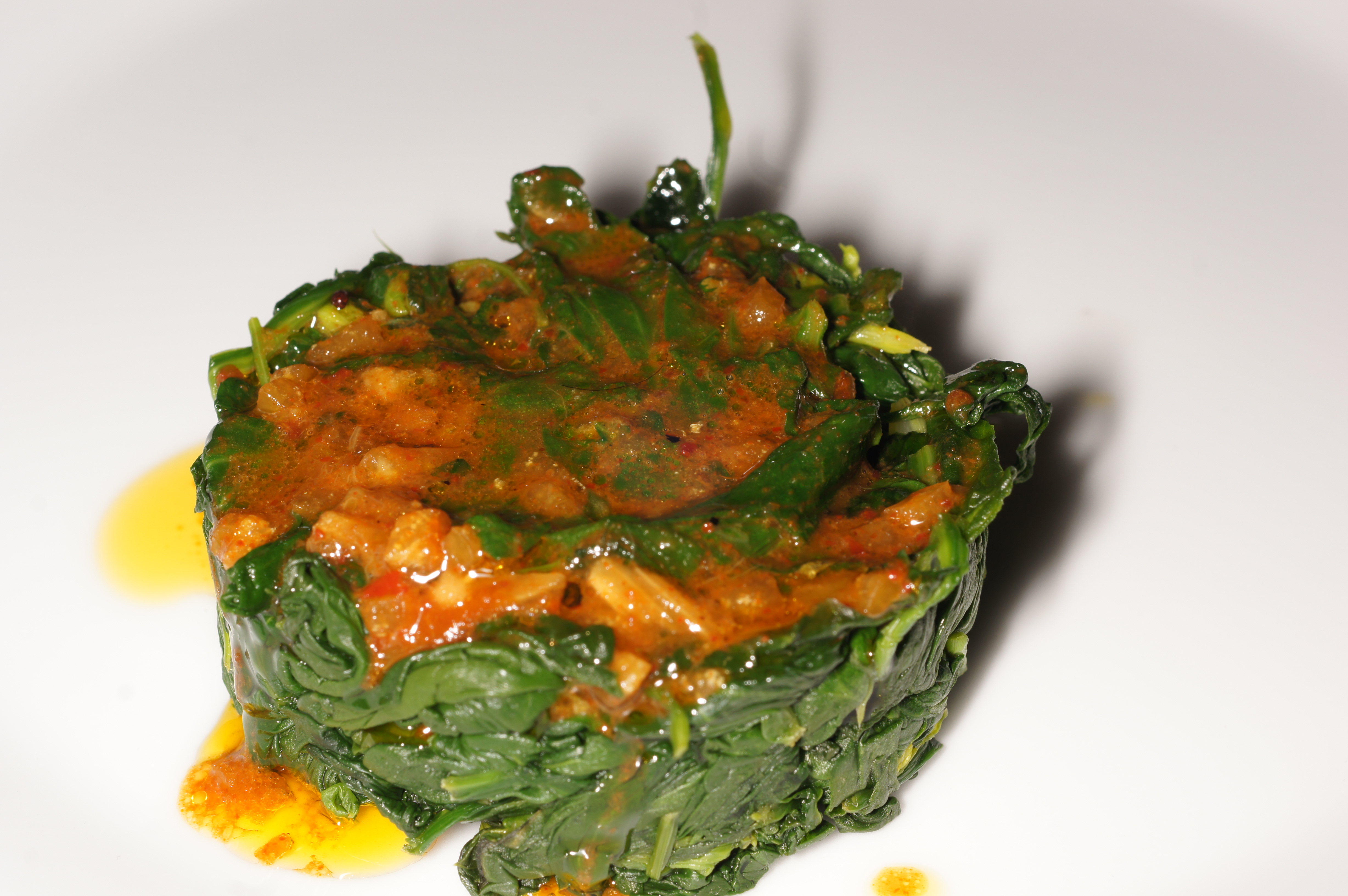This recipe originates from a spinach salad made by Hassan M’souli in Moroccan Modern. We prefer it as a hot side dish. Also, his original dish calls for sweet paprika. We like the smokiness and added depth of character and flavor with La Chinata Smoked Hot Paprika. You get the nice earthy flavor and body of the baby spinach coupled with the floral characteristic of the parsley and cilantro, the hint of celery from the celery leaves with the saltiness and lemoniness from the preserved lemon, coupled with the acid from the lemon juice, perfume of the garlic and the depth of flavor from the paprika. All of this is then creamed out by the goat cheese. This dish is is stunningly delicious!