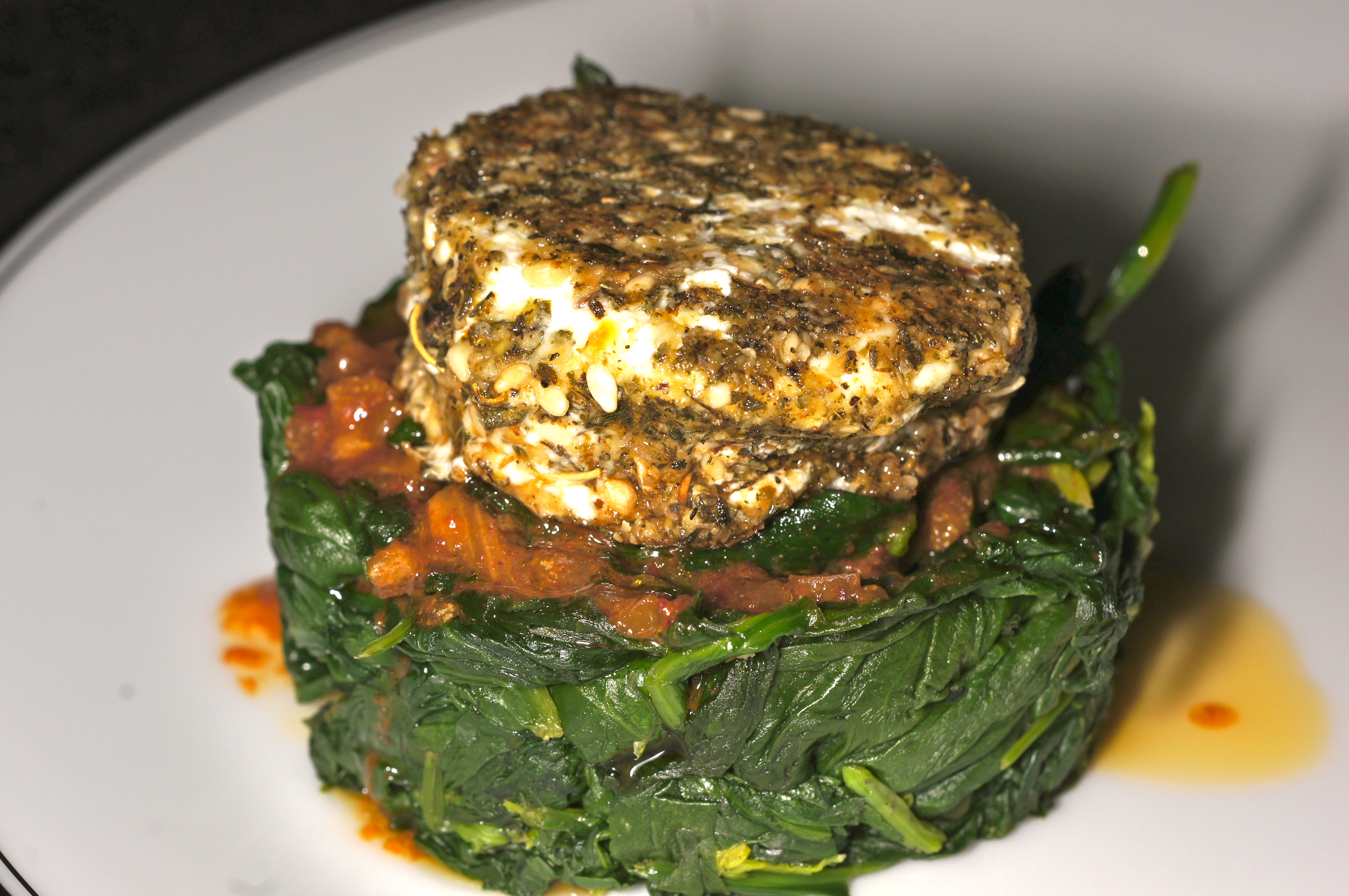 Cut the goat cheese log into 4 pieces, dip into the egg whites then into the Za’atar. Lightly oil a non-stick pan and fry the goat cheese slices for 2 minutes on each side. Place on top of spinach. Serve and enjoy.
