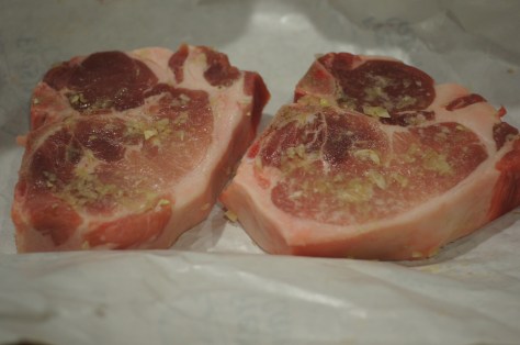 While peppers stand, mince and mash half of garlic to a paste with 3/4 teaspoon salt. Smear on the pork chops.