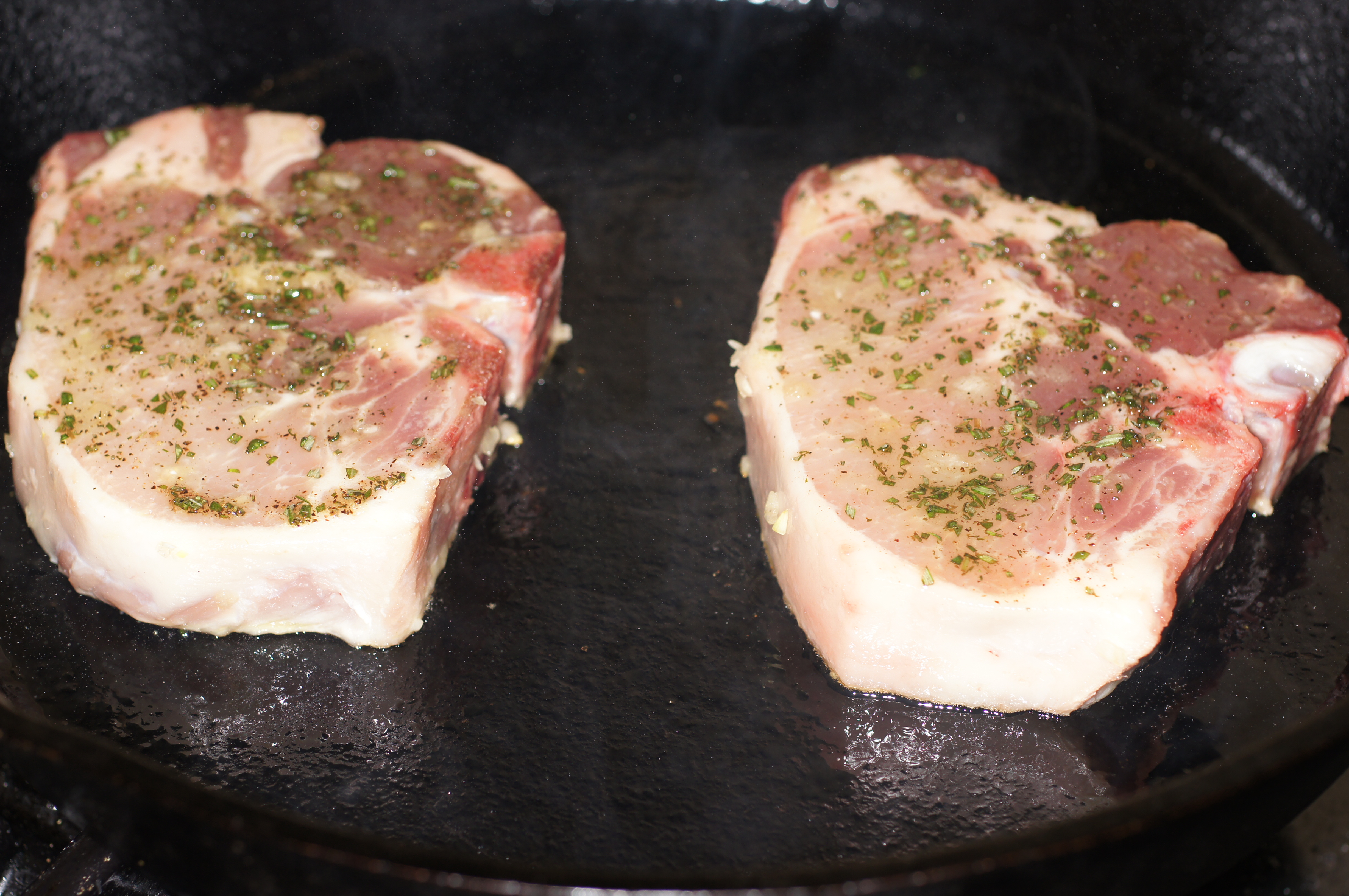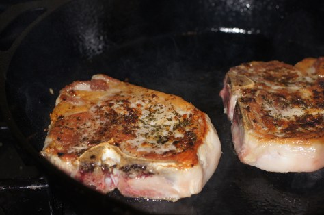 Cook chops turning once, until beautifully golden and just cooked through, roughly 4 minutes per side.  Remember, all stoves/ranges have temperature adjustments for a reason.  Heating the skillet to high heat to heat the oil and the skillet will quickly sear the meat.  Dropping the temperature to medium allows for longer, slower cooking to enable caramelization of the sugars without burning providing you that nice golden crust you want.