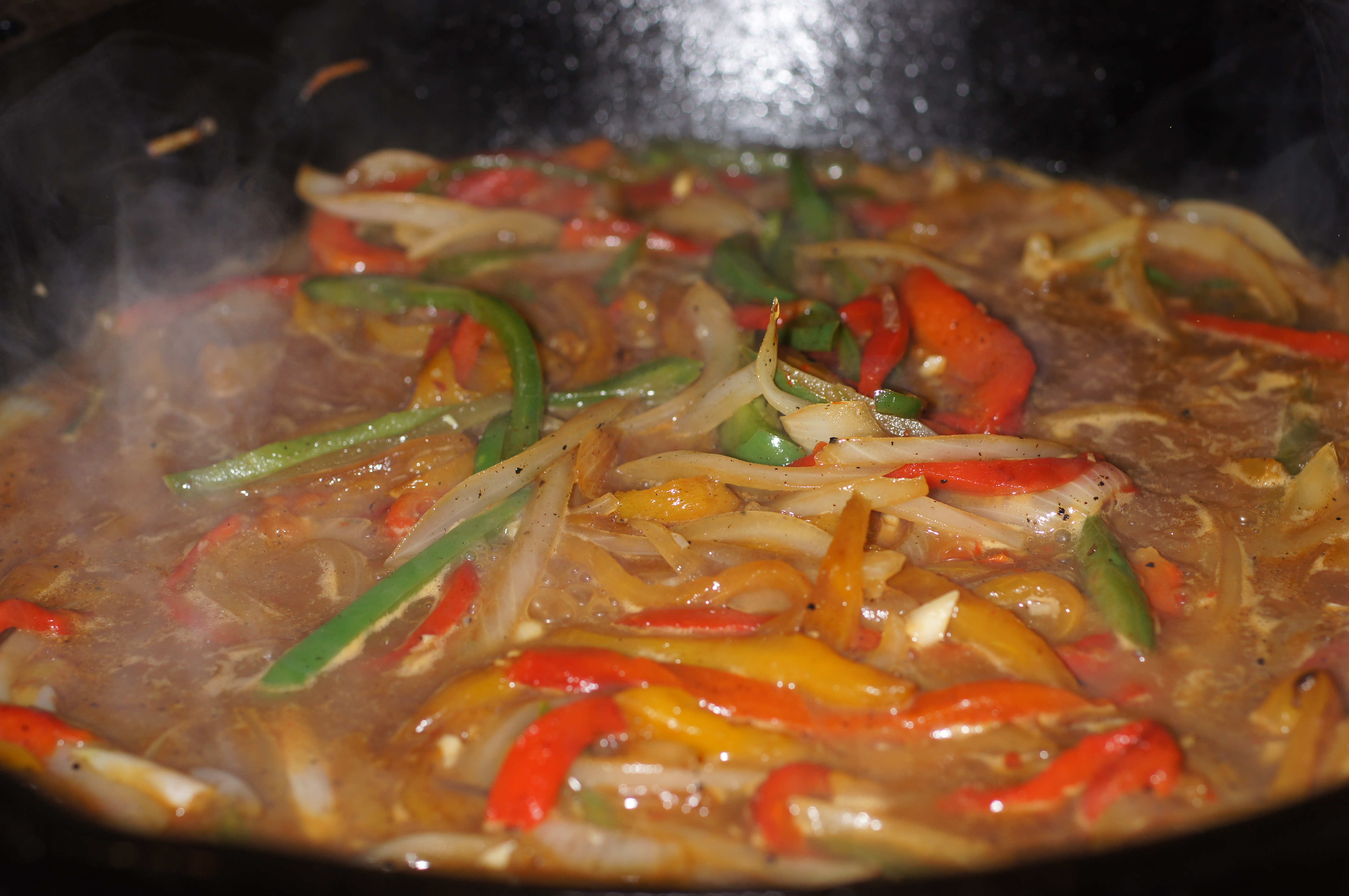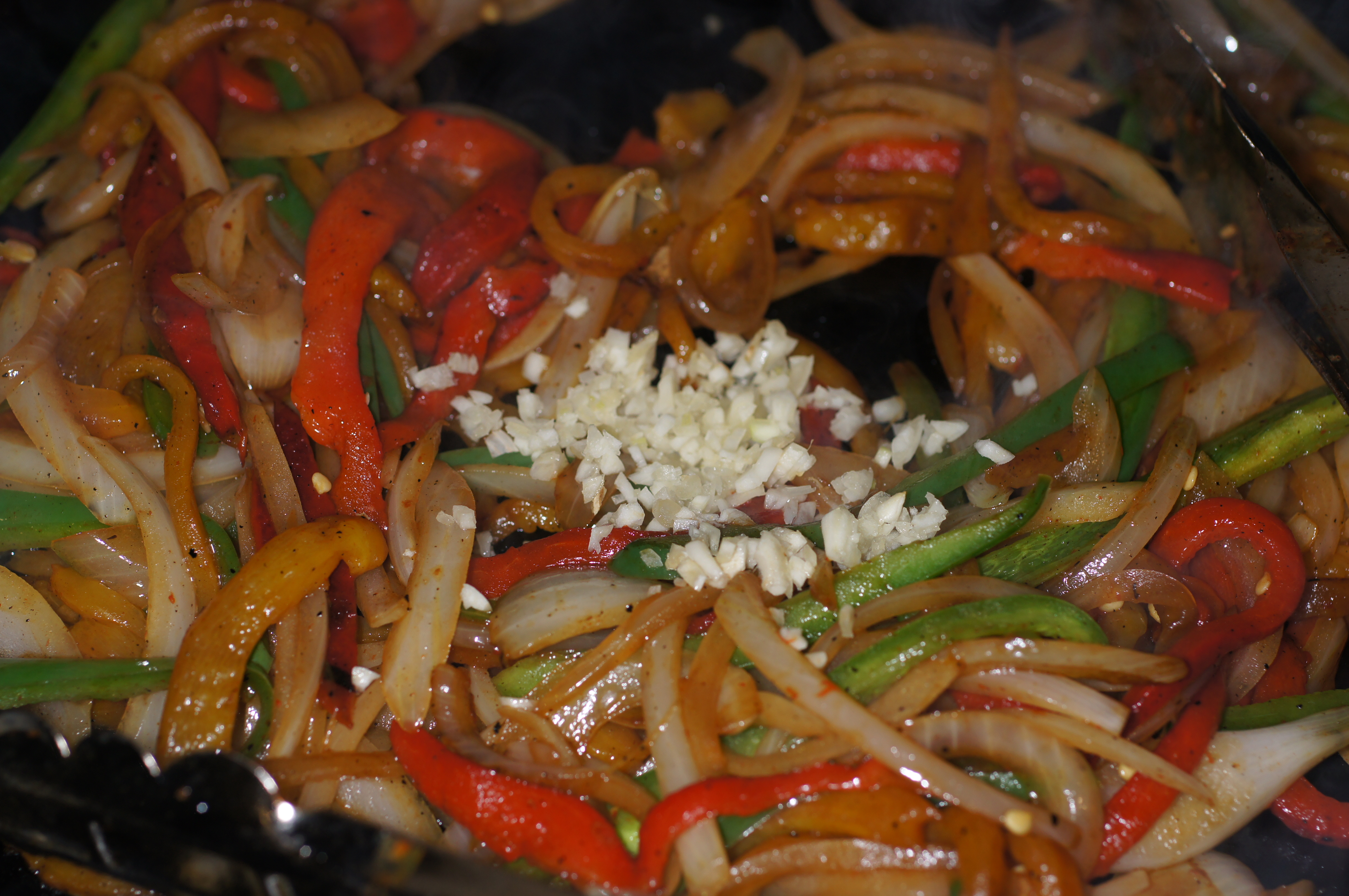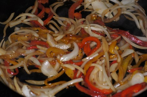 Roast the bell peppers. Roasting peppers is shown in Stuffed Roasted Red Chile a la Richard. Peel, then halve lengthwise, discarding stems and seeds. Cut peppers into 1/2 inch slices lengthwise.