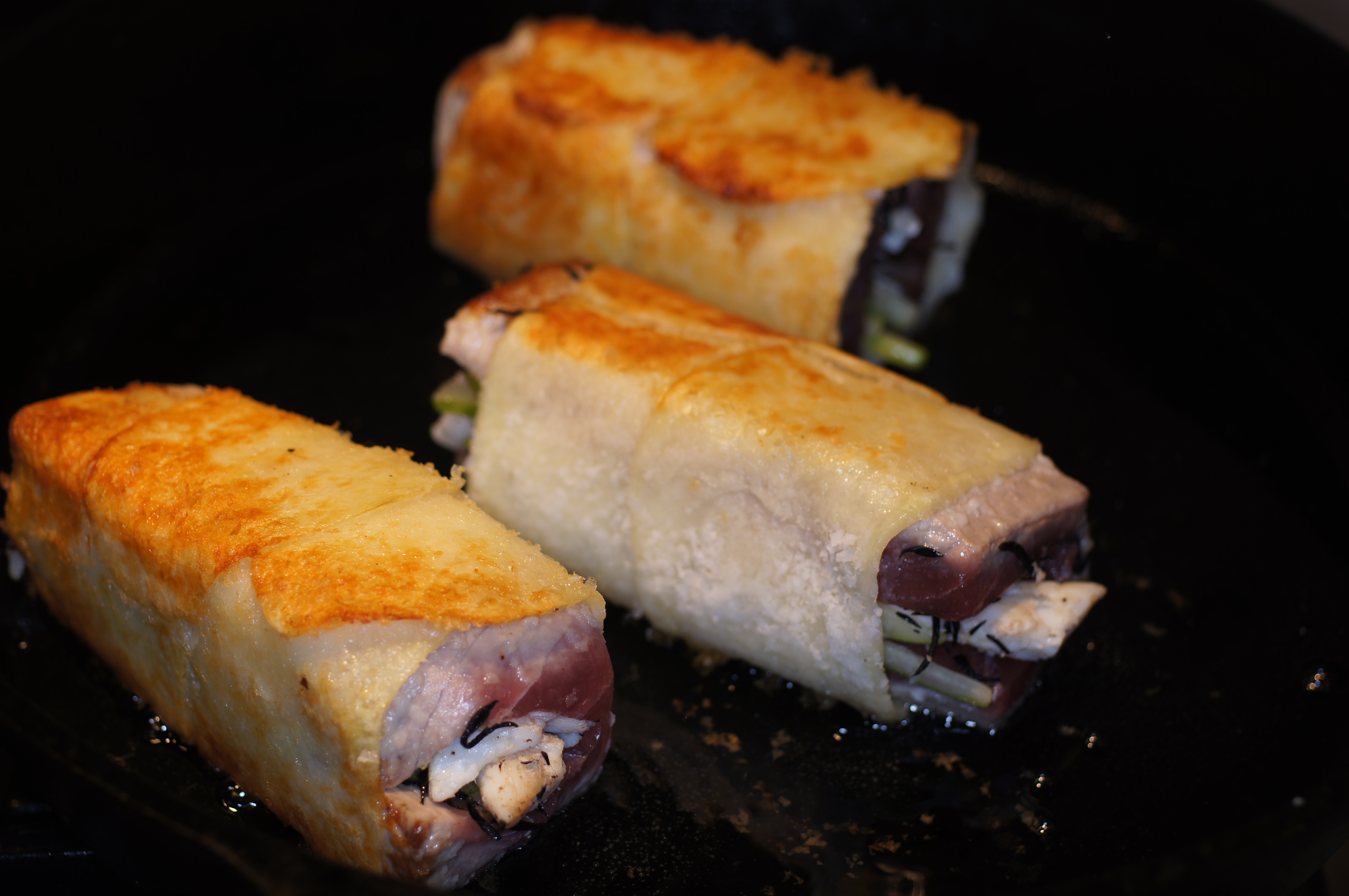 Place the potato-wrapped tuna block in a skillet with some oil and pan-fry for 45 seconds on each side.