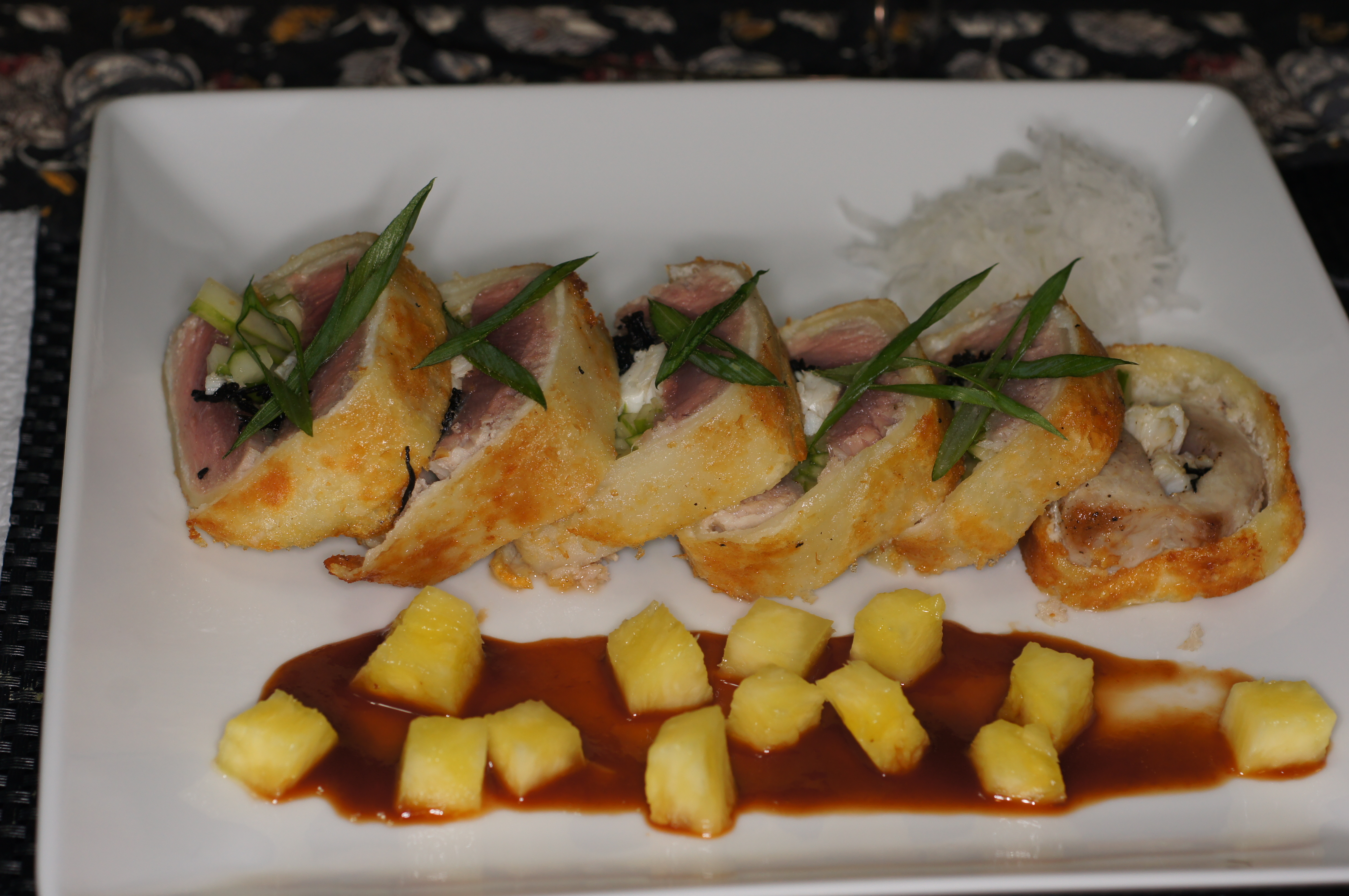 Potato Crusted Tuna Stuffed with Crab & Cucumber Served with Diced Pineapple & Ponzu Dressing