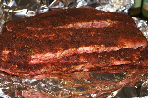 Generously cover the ribs in the rub, stacking the racks side-by-side and one rack on top of the other.