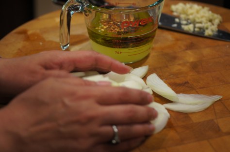 While the onions are cooking, mix olive oil, lemon,chili flakes, salt and pepper to taste. Using a small blender or food processor, emulsify ingredients to a dressing consistency.