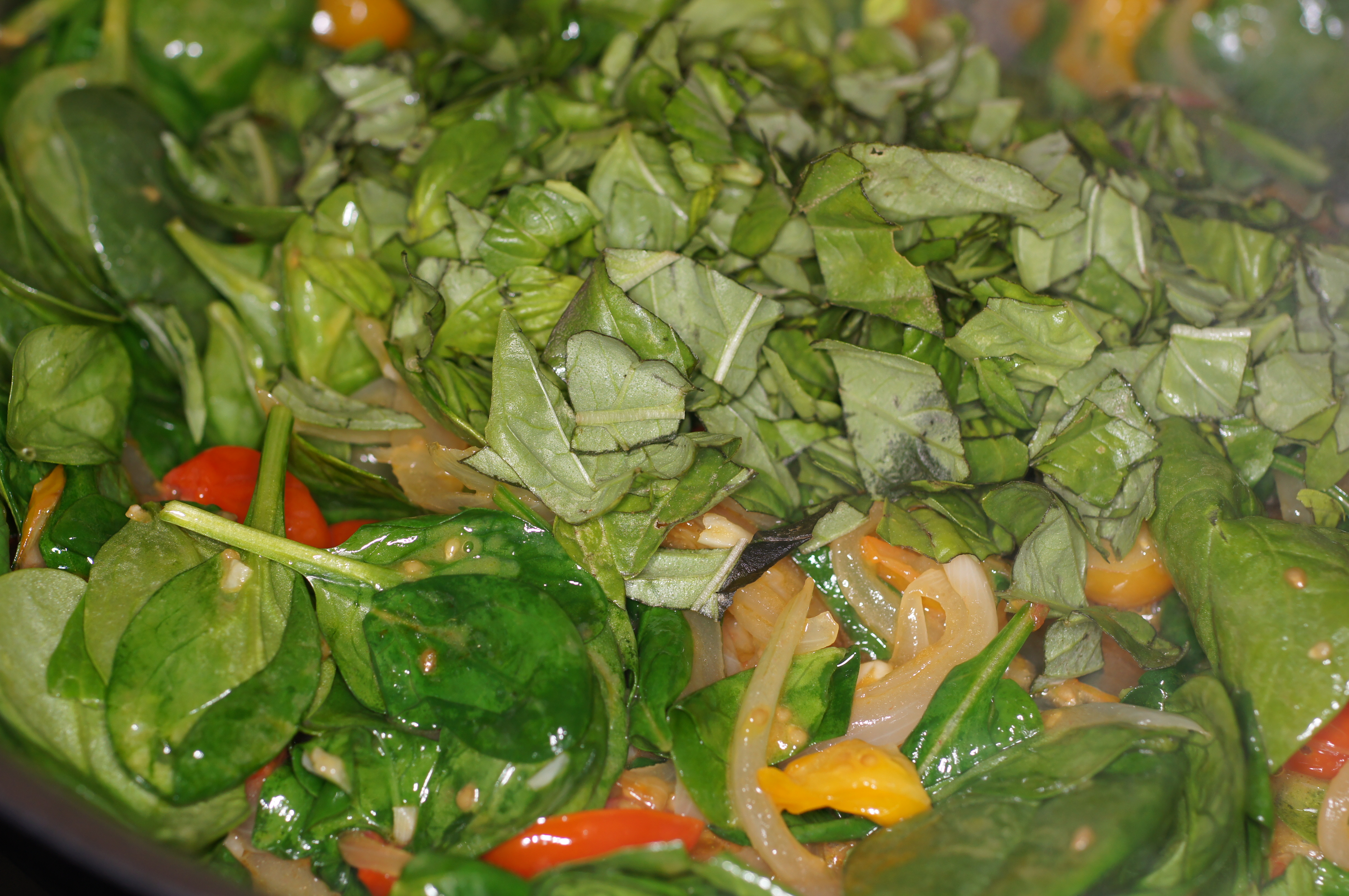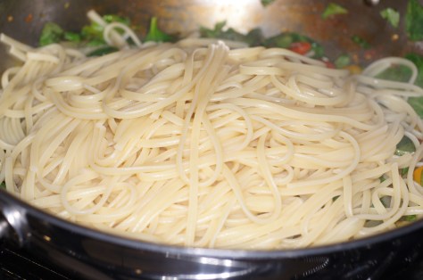 2 Minutes before the pasta is ready, raise heat to high. Toss on high heat and add basil.