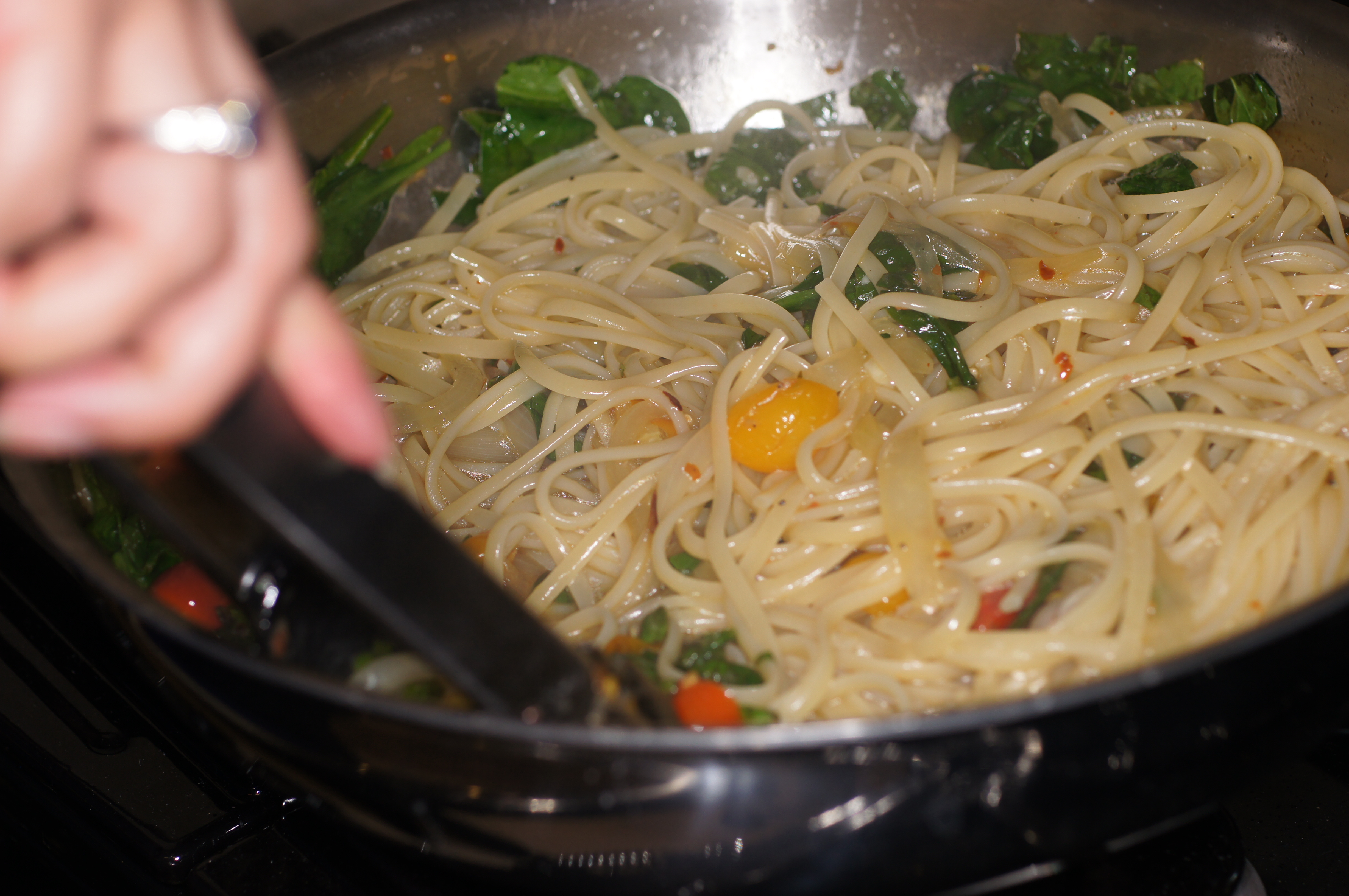 Sauté on low until tomatoes begin to soften. Then turn off heat and add garlic. Allow to sit for at least five minutes on residual heat. Add spinach and capers.