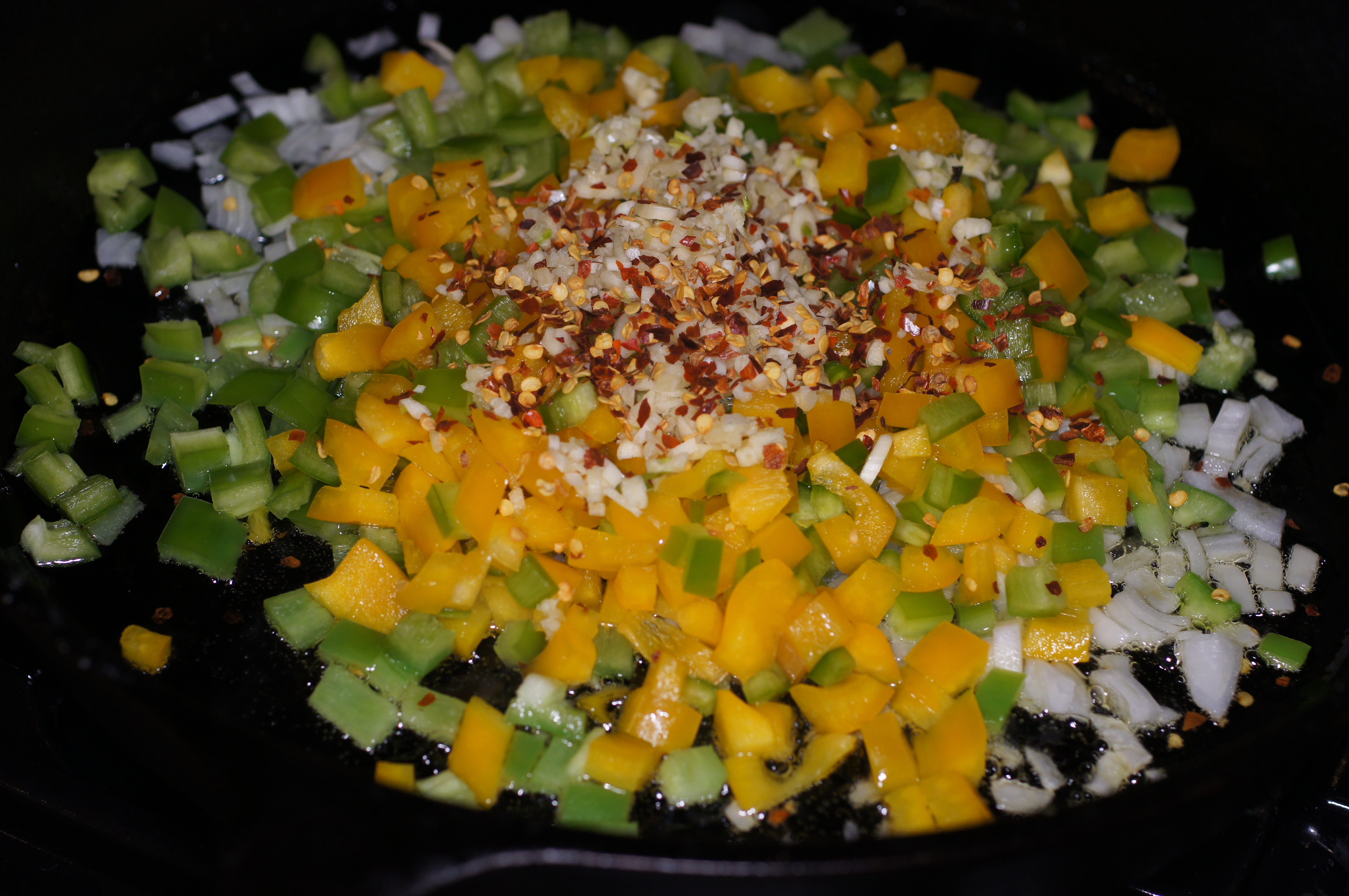 Heat 6 tablespoons oil in heavy large pot over medium-high heat. Add onions, bell peppers, garlic and crushed pepper and sauté 3 minutes.