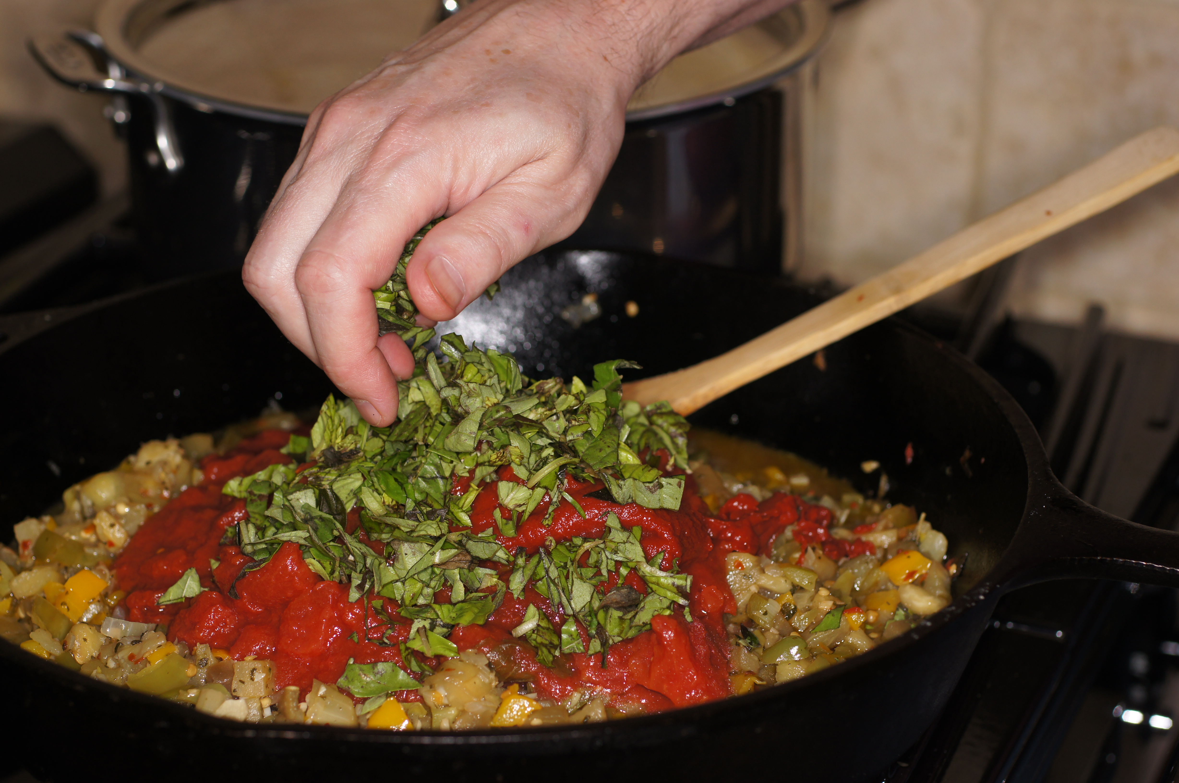 Reduce heat to medium-low. Cover; cook until eggplant softens, stirring often, about 15 minutes. Mix in tomatoes with juices, 1 cup basil, olives, tomato paste and vinegar.