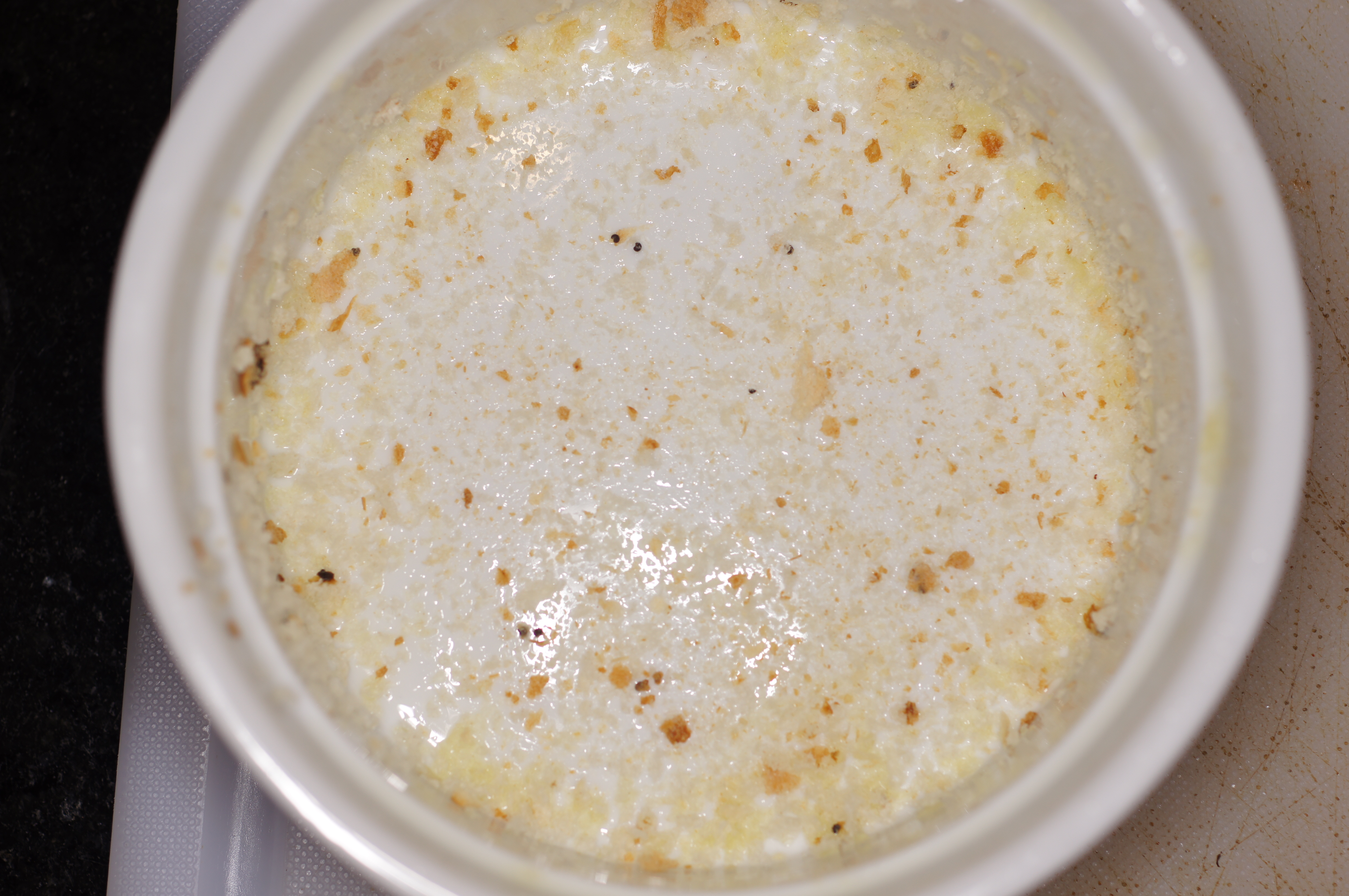 Oil a 5-1/2 inch x 2-1/2 inch baking dish and dust with bread crumbs.