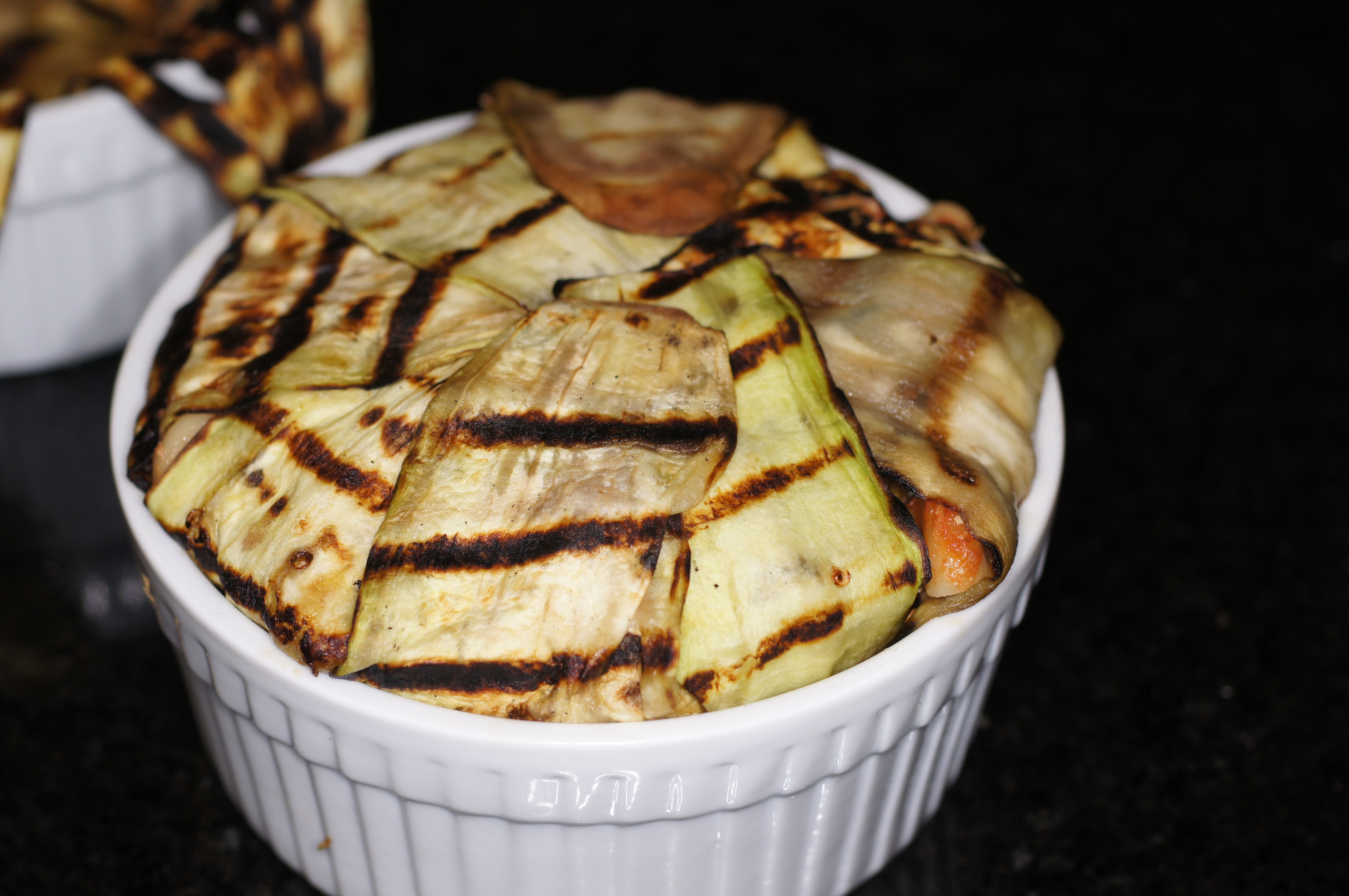 Peel and slice 2 large Eggplants into 1/4 inch slices. Lightly oil and season with salt. Grill and set aside to cool.