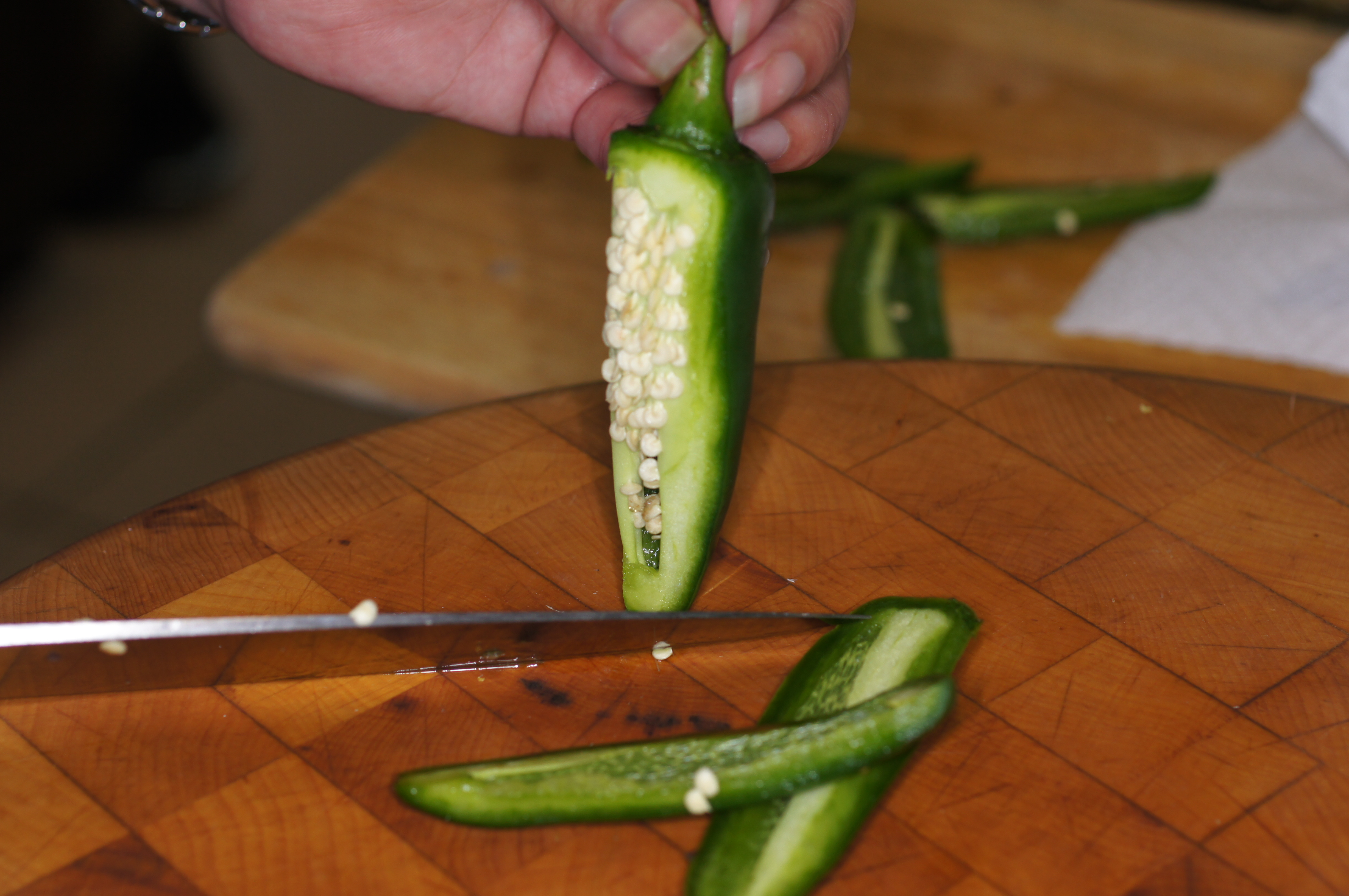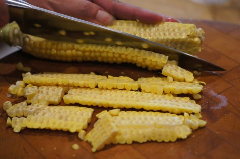 Baby Lady uses a neat trick to cut the kernels from the cob. Most people stand the corn on end and cut downward which results in kernels going all over the kitchen. Baby Lady, instead, lays the corn on its side and cuts the kernels like you would slice a zucchini lengthwise. No hassle, no mess. Why people stood the corn on end is beyond me as you don’t cut many things that way, unless you’re Baby Lady dicing a jalapeño but that is the next portion of this story.