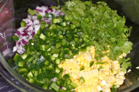 Husk corn and remove kernels from cob. Notice, Baby Lady does not grill or roast the corn. She likes its crunchy texture and natural sweet flavor. It goes beautifully with the meal and this salsa.